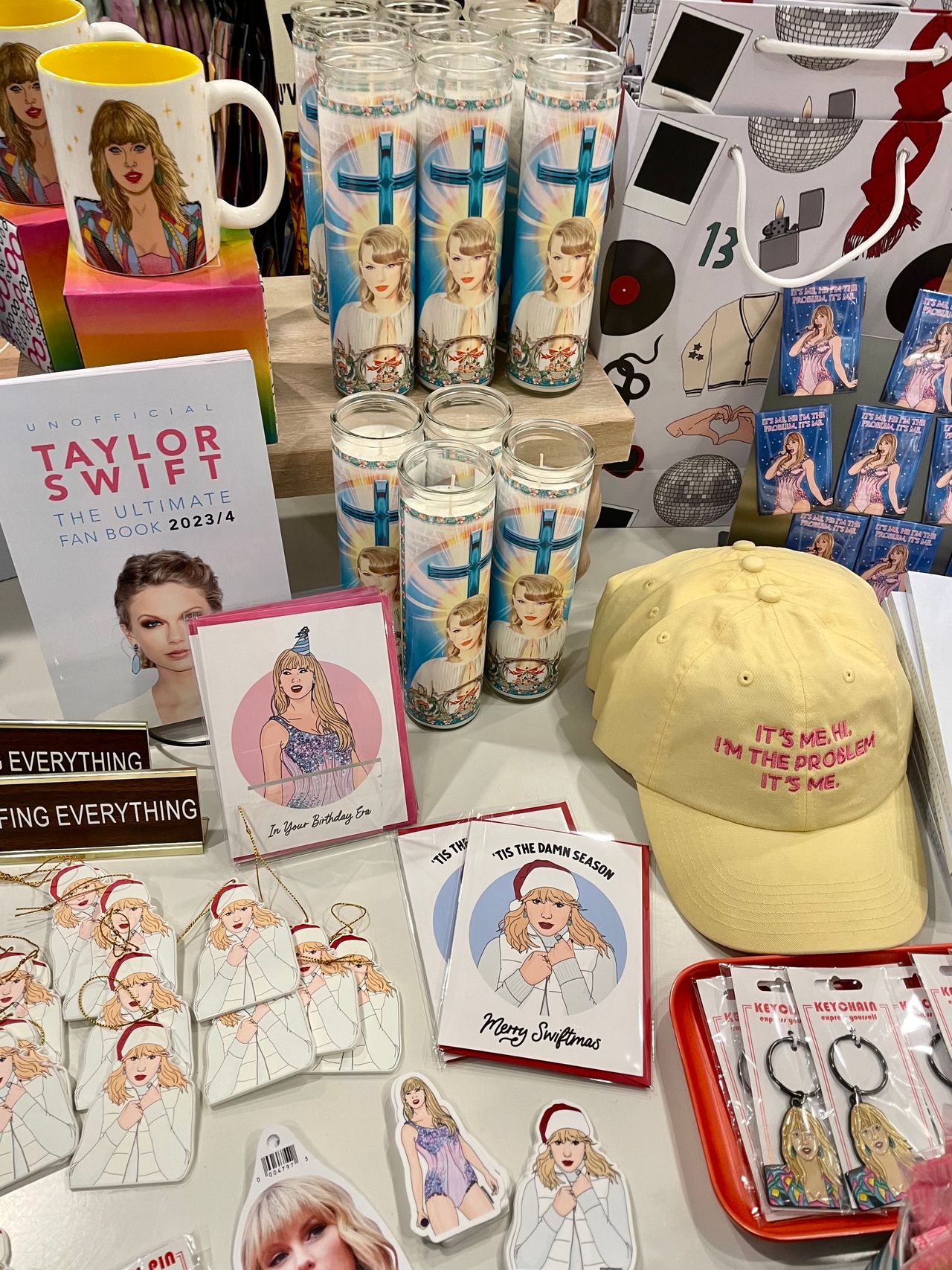 Renée Olson通常不會在她的新澤西州Frenchtown禮品店Sublime中儲備與流行文化相關的商品,但在泰勒·斯威夫特的這一年,她破例了。自10月底以來,她店裏的一張桌子上擺滿了各種商品,從5美元的手纏友誼手鍊貼紙到25美元裝飾有這位明星面孔的祈禱蠟燭。一款37美元的“Merry Swiftmas”袋子已經售罄。