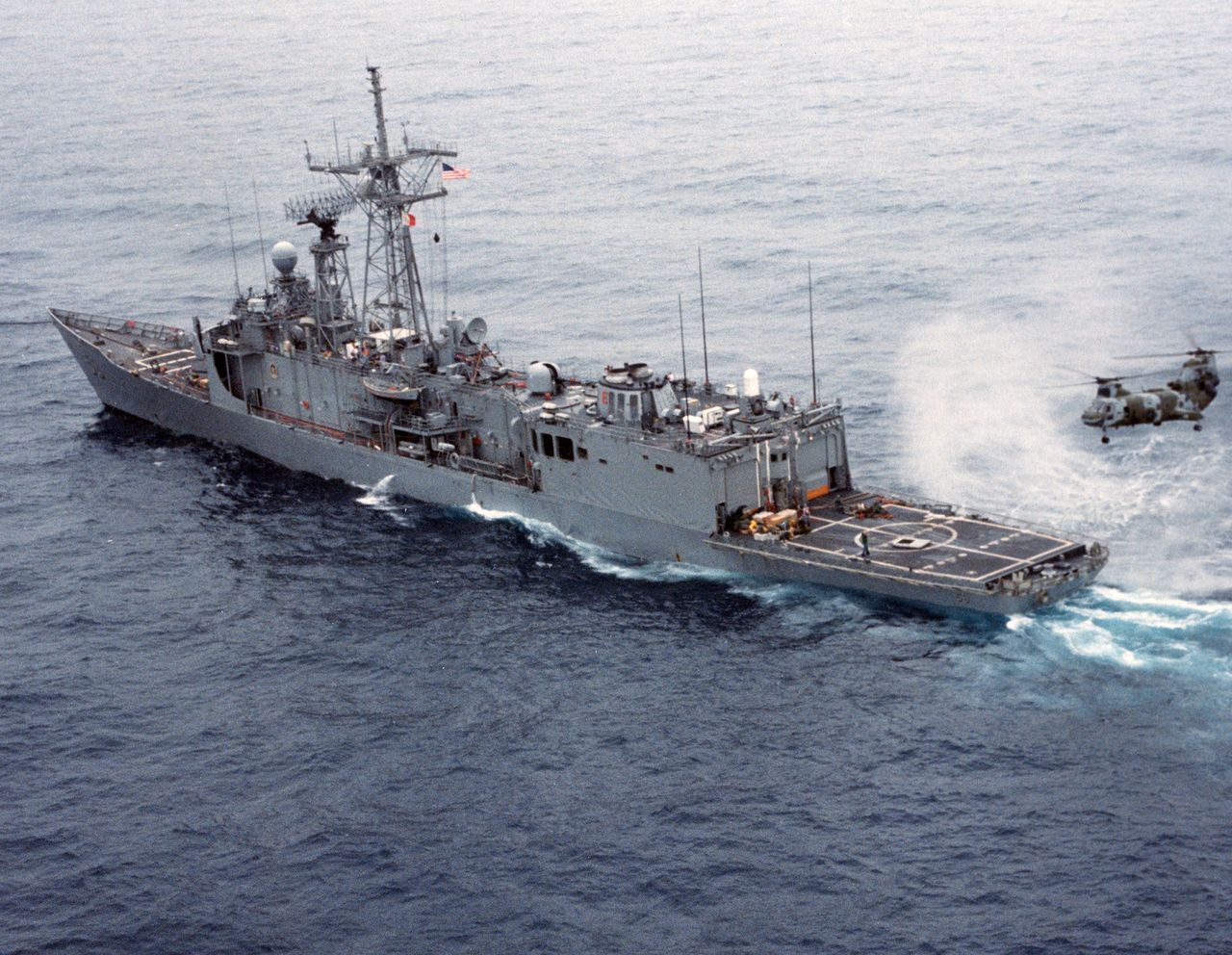 1988年4月14日,美國海軍"塞繆爾·B·羅伯茨"號在波斯灣觸雷後繼續航行。圖片來源:海軍歷史與遺產司令部五角大樓副新聞秘書薩布麗娜·辛格近日強調:“我們並未與胡塞武裝處於武裝衝突狀態”,“我們在該地區部分原因是為了加強威懾力量。”