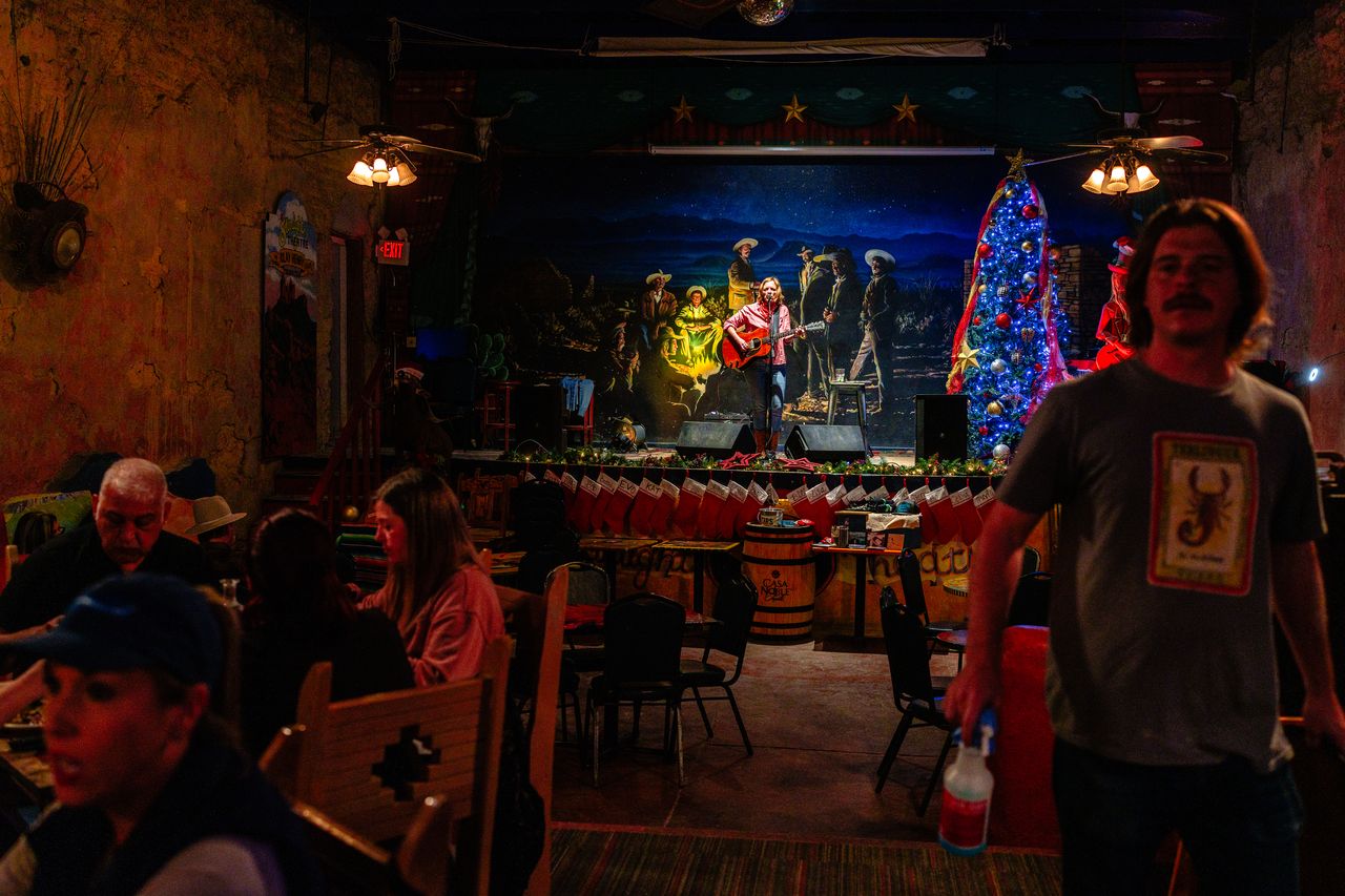 遊客們在特靈瓜星光劇院邊用餐邊欣賞現場音樂,這個特色場所助力這個西德州邊陲小鎮成為熱門旅遊目的地。發言人湯姆·範登伯格表示,大本德國家公園近年遊客增幅遠超其他多數國家公園,從2019年的44萬人次躍升至2021年的58.1萬,今年將再次突破50萬大關。