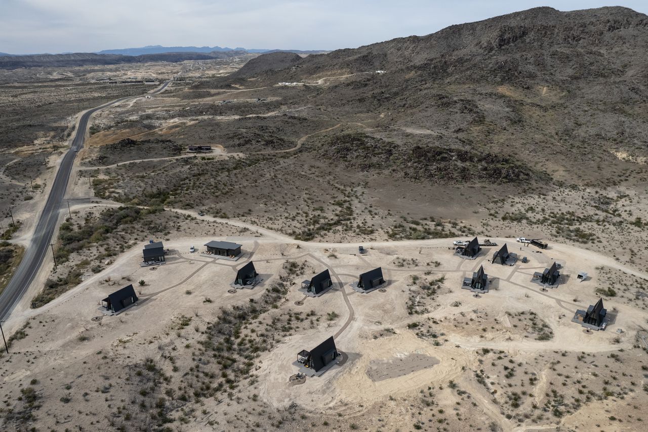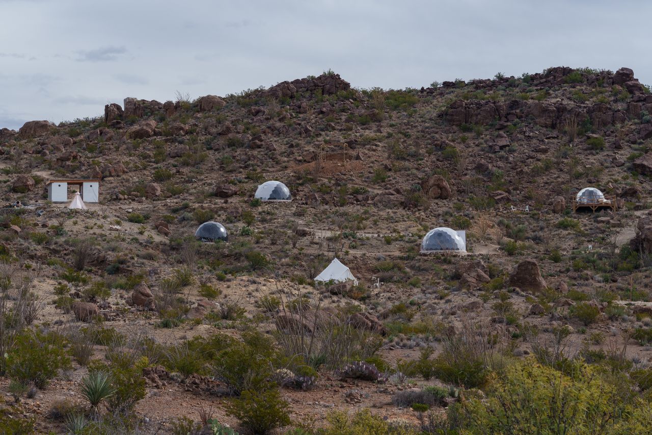 如今,數十棟嶄新小別墅的玻璃窗在鏽褐色山巒間閃閃發光。由圓錐帳篷、穹頂屋、A字框架和集裝箱改建的租賃村落遍佈灌木叢生的山坡。這個未建制化的西德克薩斯前哨站特靈瓜,已成為愛彼迎和Instagram用户羣體的重要旅遊目的地。