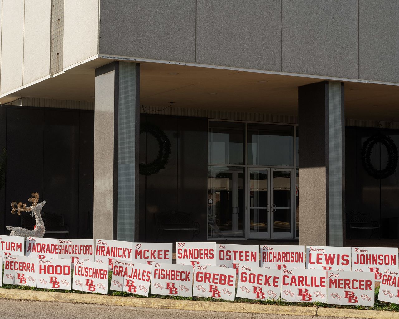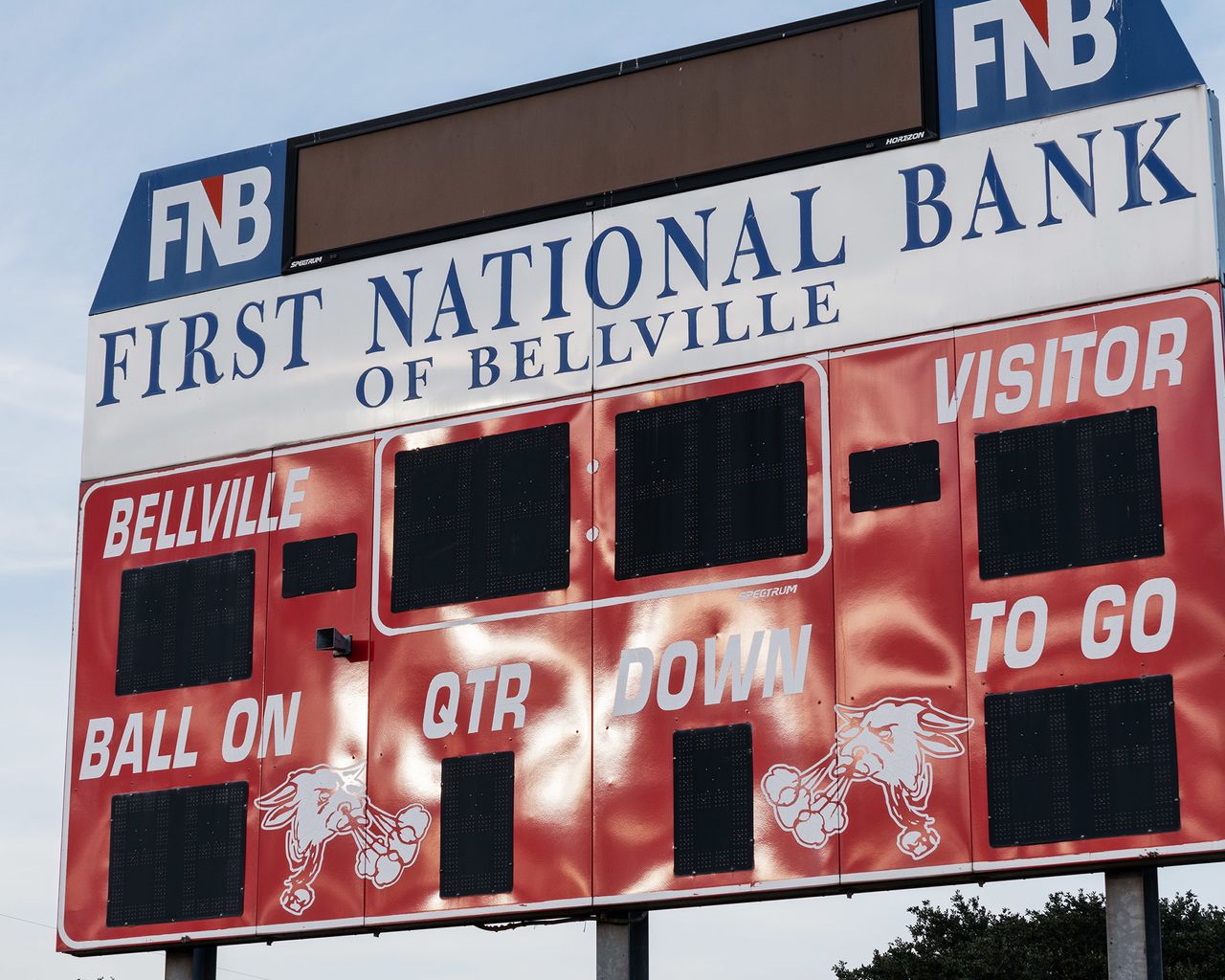 貝爾維爾高中橄欖球員姓名標識牌。工業銀行為當地居民包租巴士,方便他們觀看球隊比賽。