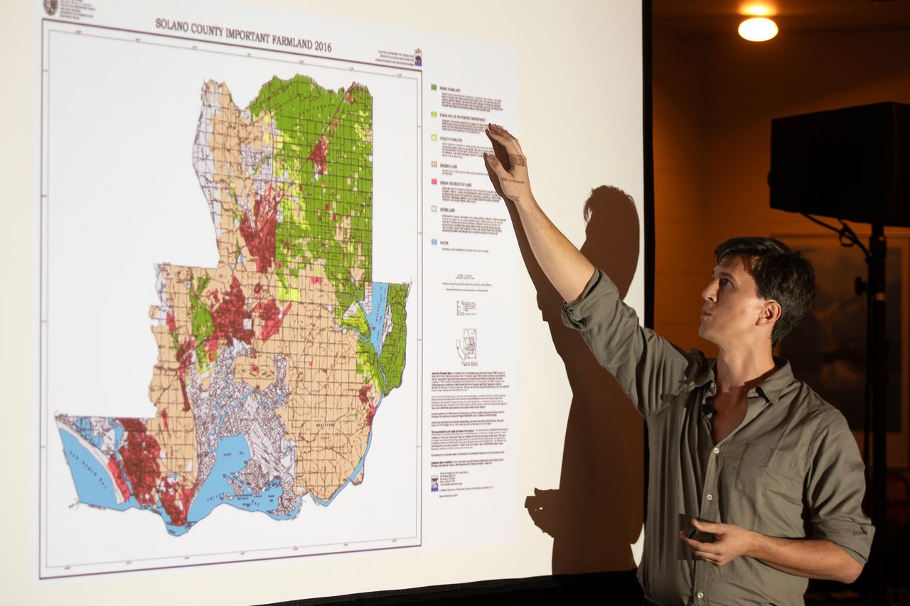 加州永恆創始人Jan Sramek近期在里奧維斯塔市鎮廳進行項目宣講,就該開發計劃徵求公眾意見。圖片來源:D. Ross Cameron在為期五年、低調的收購狂潮中,由斯拉梅克成立的一家公司成為加州索拉諾縣最大地主,同時隱藏了投資者身份。搶購的地塊包括美國軍方太平洋行動樞紐特拉維斯空軍基地周邊的土地。