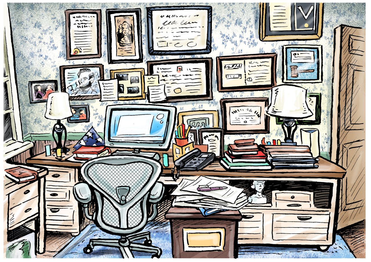 本專欄的配圖由藝術家查德·克勞根據一張照片繪製而成,描繪的是我的辦公室。這裏不僅是本專欄的誕生地,也是此刻我思念多年讀者之處。衷心感謝你們一直以來的閲讀。在這個小角落——抱歉,比爾,應該説在這個專欄中——驅使我筆耕不輟的動力,正是你我共同懷有的那份守護與維繫的心願:讓一切得以延續,免於分崩離析。能成為這份事業的一部分,實乃幸事,亦為殊榮。現在,讓我們邁向2024年。