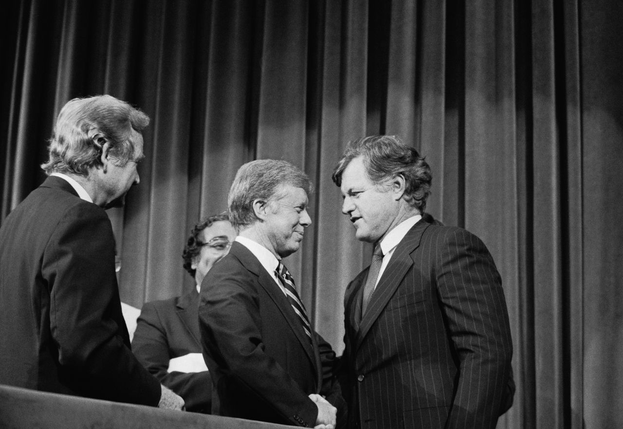 1980年,參議員泰德·肯尼迪曾挑戰卡特爭奪民主黨提名。圖片來源:貝特曼檔案館拜登早年近距離觀察卡特執政的經歷讓他汲取了政治教訓——尤其是對黨內掌控必須鐵腕。當年卡特曾面臨已故參議員泰德·肯尼迪(馬薩諸塞州民主黨人)的激烈初選挑戰,而拜登則竭力與黨內自由派保持聯繫。雖然目前幾乎沒有民主黨挑戰者能撼動拜登,但他正面臨另一位肯尼迪家族成員——律師小羅伯特·F·肯尼迪的勝算渺茫的第三方總統競選挑戰。