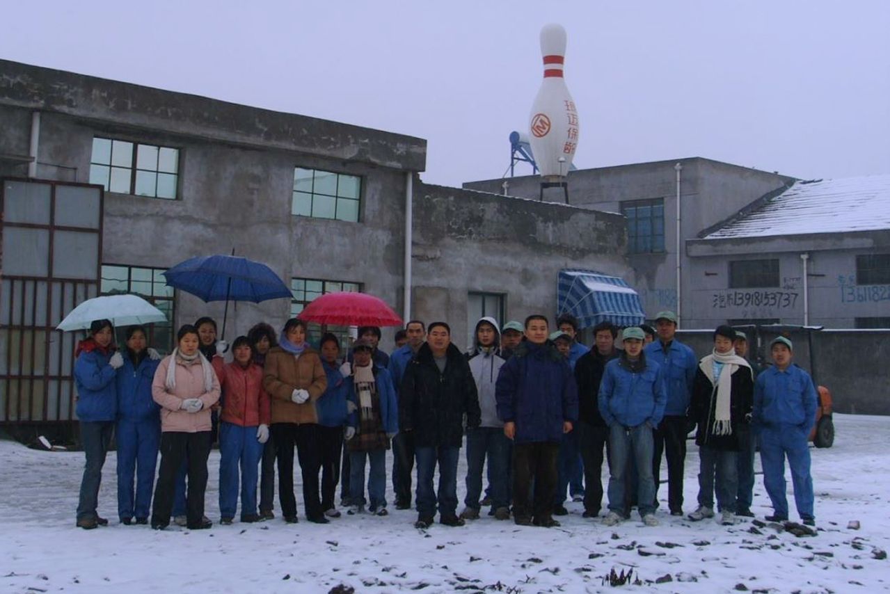 2008年,身着黑色外套的趙(中)在其已停業的上海保齡球工廠。圖片來源:Frank Zhao### 新的經濟現實