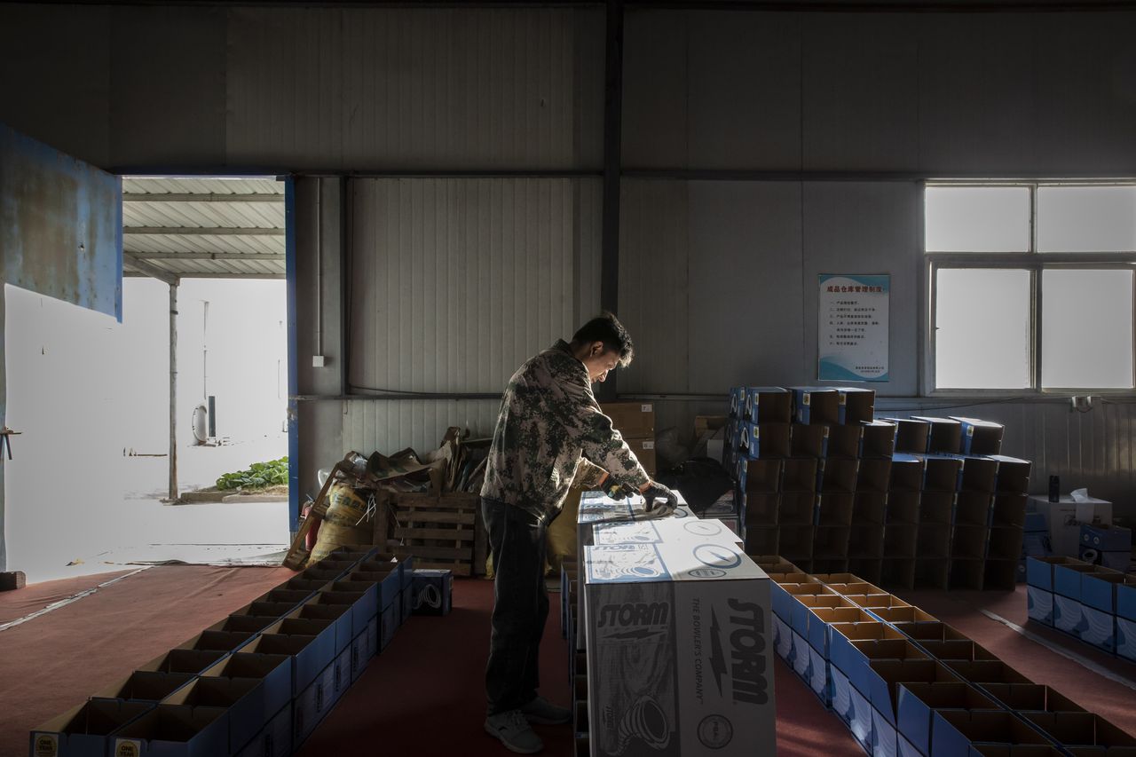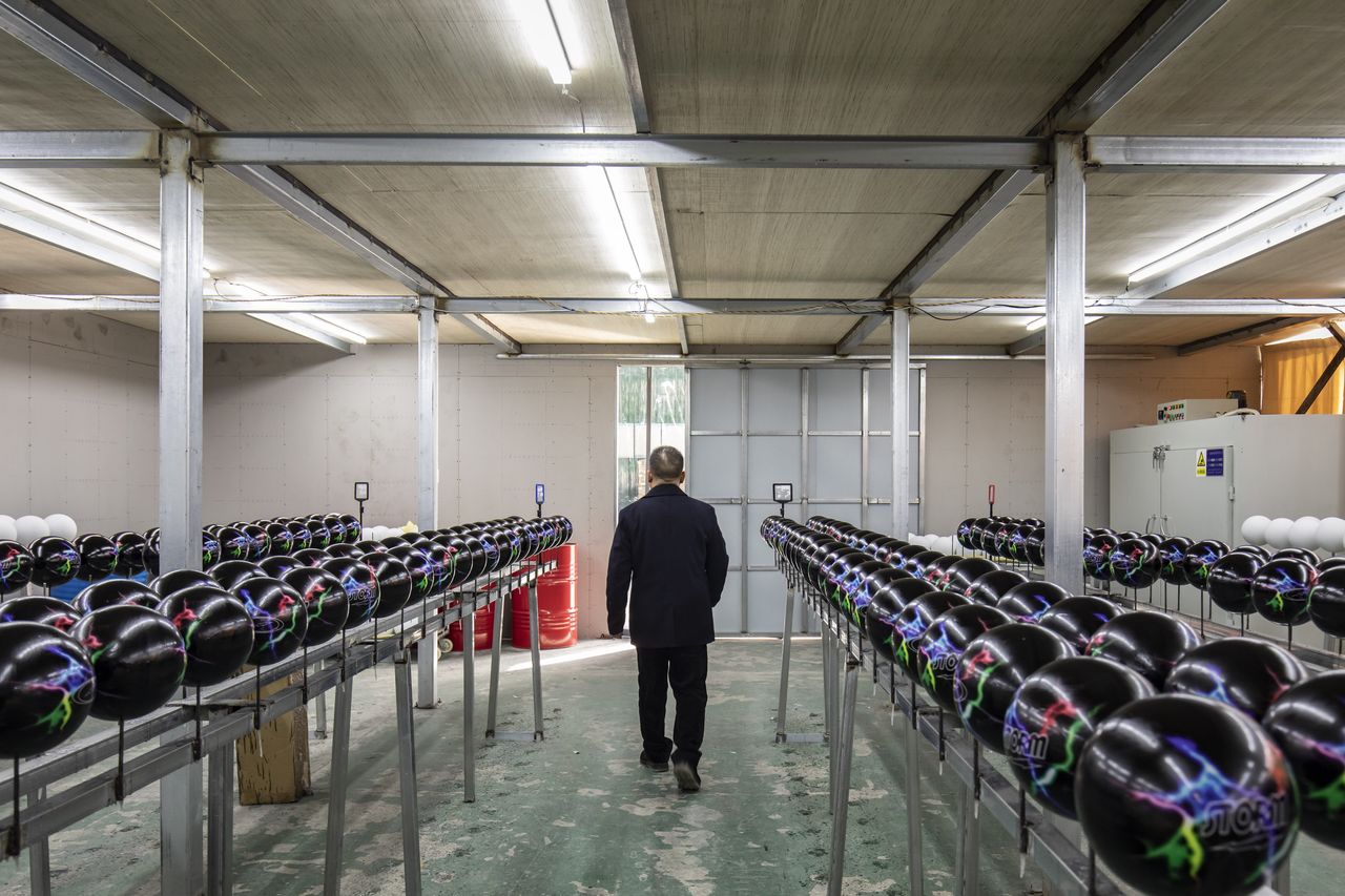 在這家工廠裏,工人們將液態聚酯倒入圓形模具,每年生產數萬個銷往美國的保齡球。