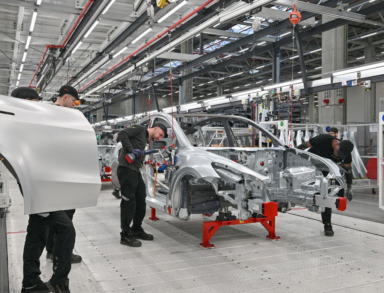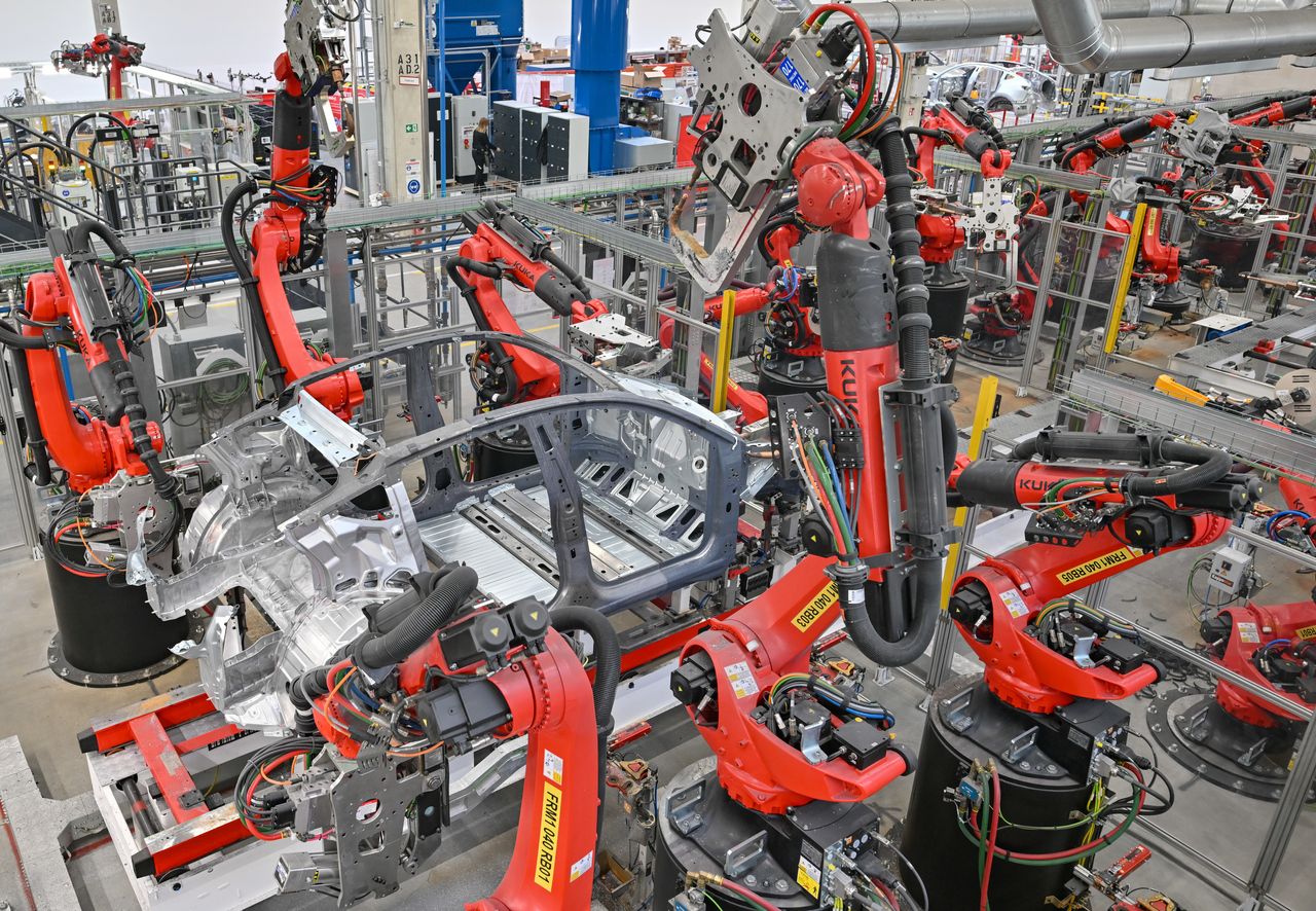 上圖:柏林超級工廠的機械臂正在焊接Model Y車身。下圖:工人進行人工裝配環節。圖片來源:Patrick Pleul/dpa/picture alliance/Getty Images
