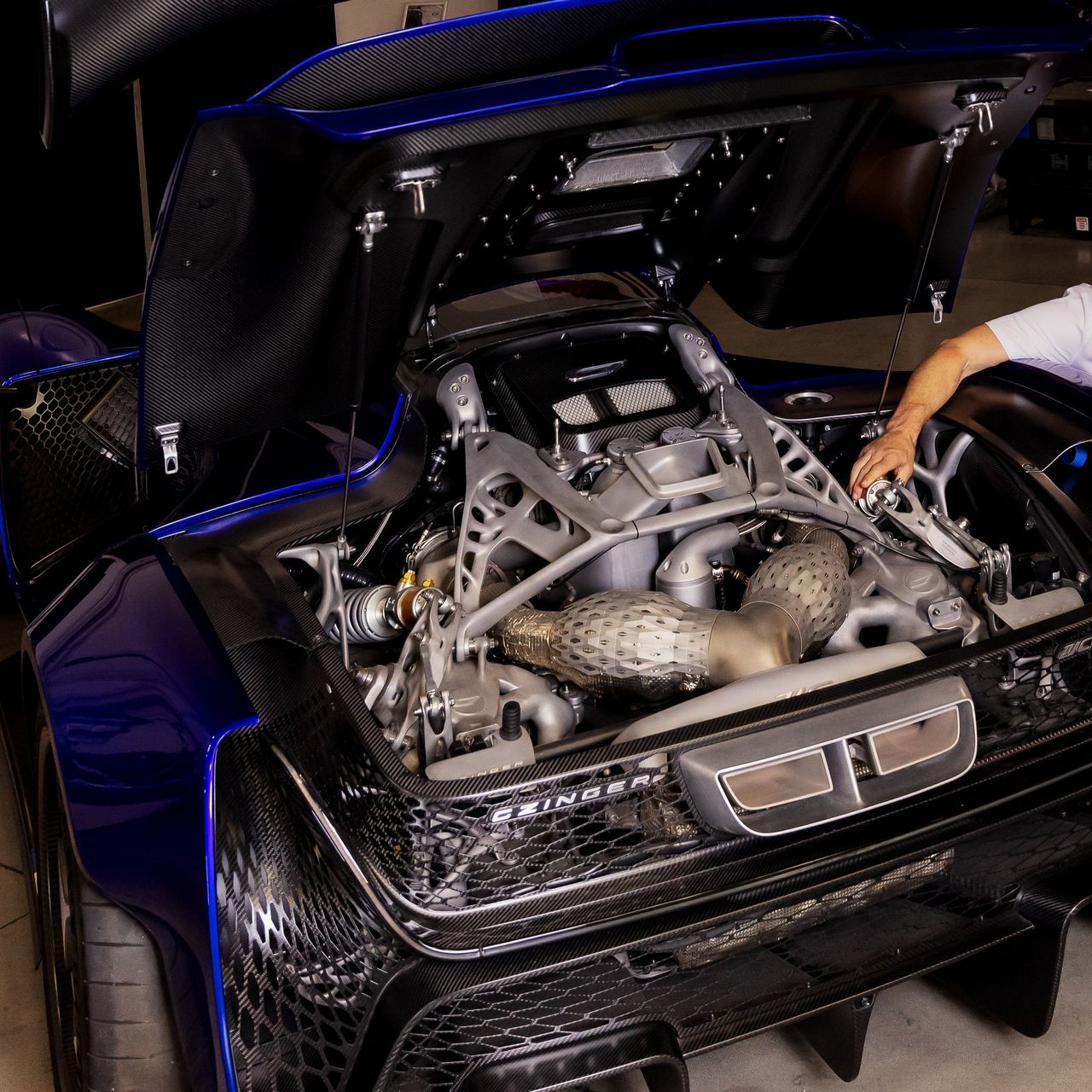 其餘大部分部件採用辛格公司專有的高性能合金配方,通過一種名為激光燒結的增材製造工藝加工而成。在我最近的參觀中,盧卡斯邀請我觀察車輛的前制動"節點”——一個籃球大小的網狀金屬結構,它替代了傳統的轉向節、輪轂和制動卡鉗。某些結構採用中空設計,用於容納液壓系統並引導氣流。“這類部件根本無法用傳統工藝製造,“他説道。