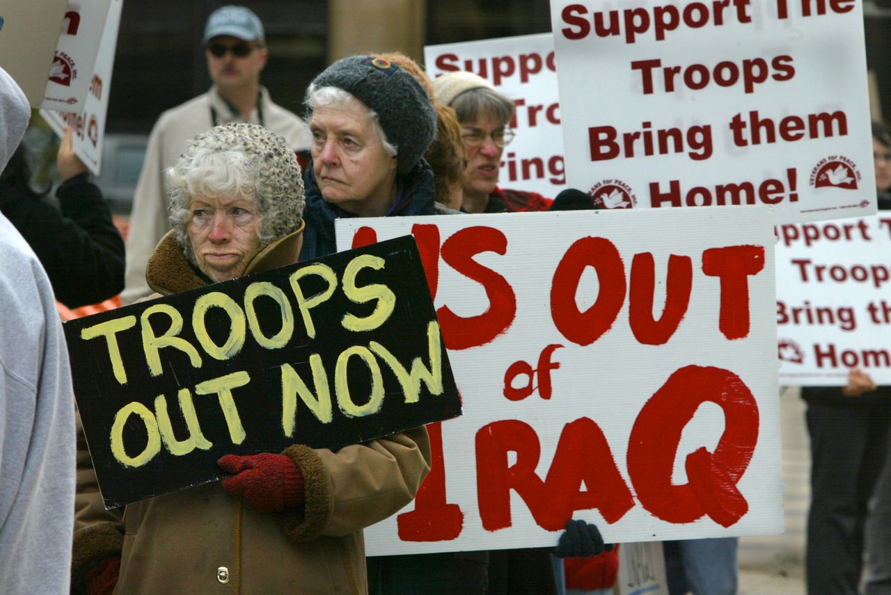 聖保羅聖約瑟夫修女會的麗塔·麥克唐納修女和瑪格麗特·科科倫修女,於2004年抗議美國參與伊拉克戰爭。照片:布魯斯·比斯平/星論壇報/蓋蒂圖片社肯尼斯·麥克唐納在第一次世界大戰期間服役於陸軍,並在法國參戰,他在明尼蘇達州沃特敦的11個孩子從小就被告知,他們的父親參加的是終結所有戰爭的戰爭。後來,他的兒子尤恩參加了第二次世界大戰,帕特里克和K.J.在朝鮮戰爭中服役,最終,他的五個兒子全部在武裝部隊服役。