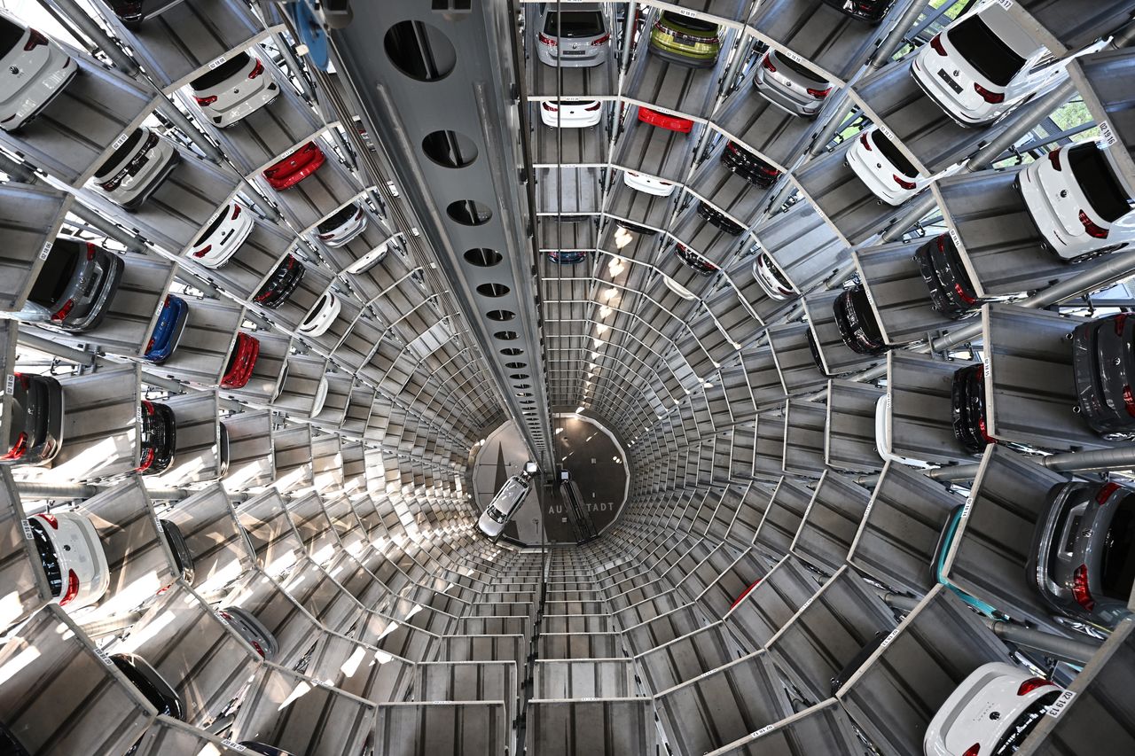 沃爾夫斯堡用作倉儲的塔樓內,大眾汽車停放在升降平台上。圖片來源:斯圖爾特·富蘭克林/蓋蒂圖片社聯繫威廉·波士頓請致信 [email protected]