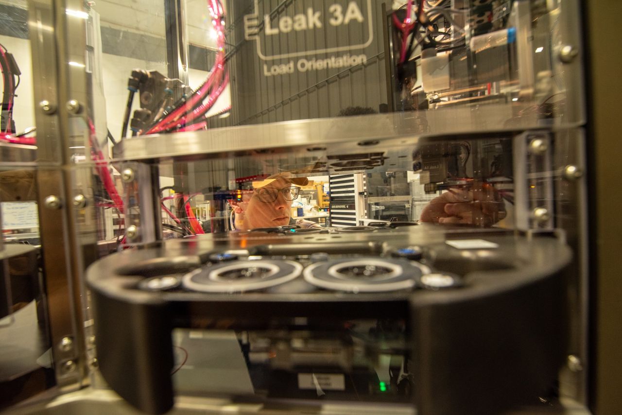 Hyperion科技集團的員工瑞安·拉德正在檢查工廠生產區的一台機器。