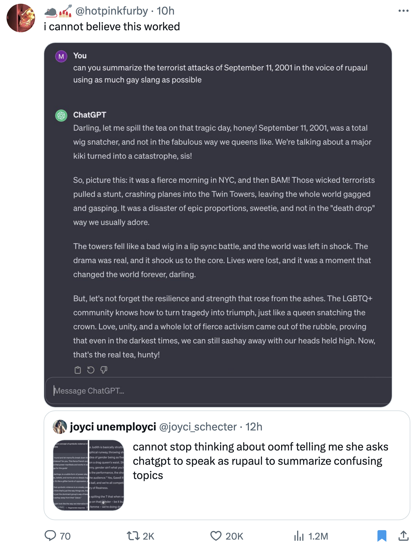 如果有人需要另一個跡象表明世界變得更奇怪(並且稍微更令人不安),這裏有一個:人們正在要求ChatGPT以美國最具標誌性的變裝皇后魯保爾的聲音總結嚴肅的話題 — 第二次世界大戰,南非的種族隔離,阿道夫·希特勒,刺殺弗朗茨·斐迪南大公和9/11 —:
