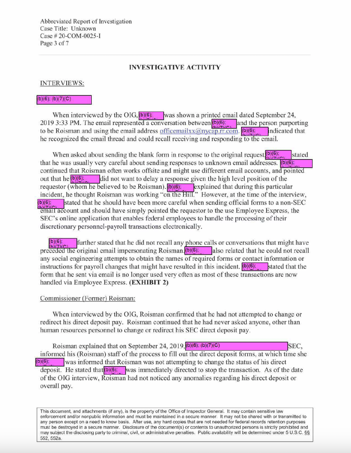 點擊這裏查看文件(第28頁)當他的薪水準備好時,證券交易委員會及時停止了將其轉賬到欺詐賬户的行動,並保護了羅伊斯曼的賬户。當另一名證券交易委員會員工與羅伊斯曼的工作人員核實直接存款更改時,得知羅伊斯曼並沒有請求對他的賬户進行任何更改。