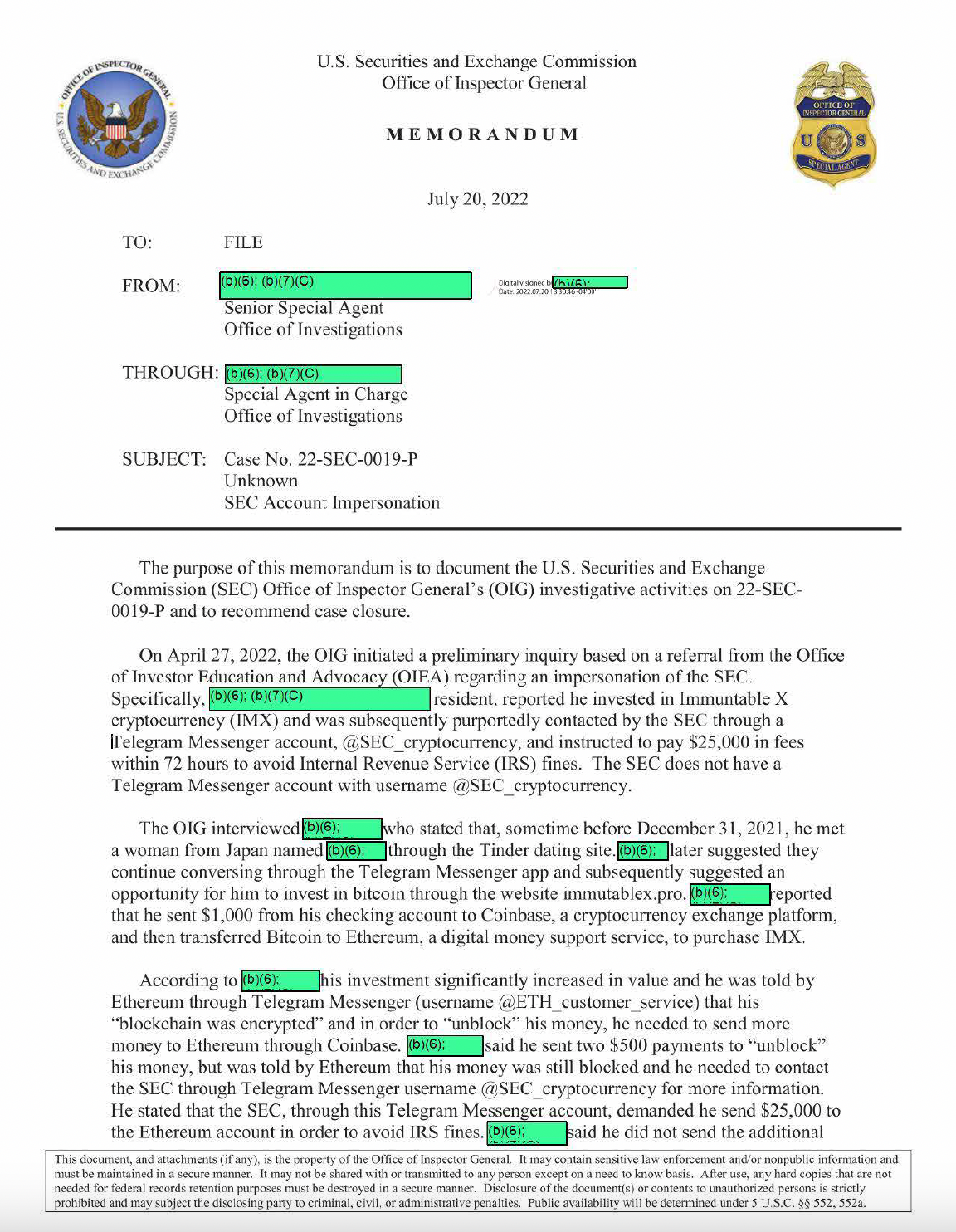審計長辦公室設有一個舉報熱線,任何人都可以撥打電話或填寫表格匿名舉報。在2020年8月,與審計長正在調查的其他案件發生在同一時間,有人提交了一份投訴,聲稱自己是“預付費欺詐計劃”的受害者。該人稱她收到了兩封來自後來意識到是冒充當時的SEC檢查部主任皮特·德里斯科爾的某人的電子郵件。