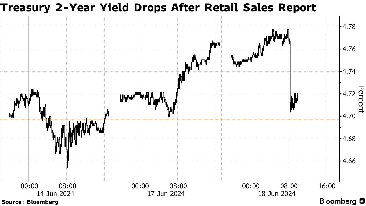 五月零售銷售低於經濟學家的預期,四月的數據也經過下調,這是最新證據顯示出新興消費者疲勞,這一情況在最近幾個交易日幫助國債市場反彈。與此同時,美國五月工業產值有所增長。週五,大多數期限的收益率達到了自四月初以來的最低水平。