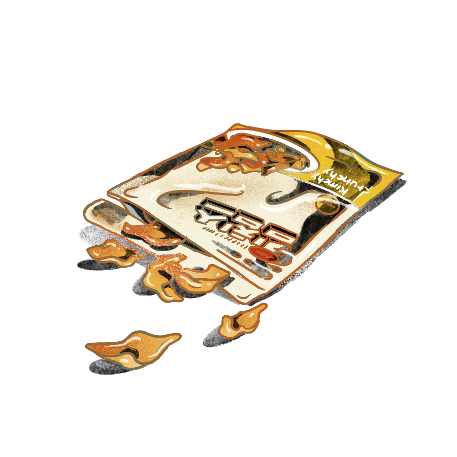 插圖:Bloomberg Businessweek 的 Beya Panicha泡菜薄脆片這款薄脆片靈感來自於深夜食堂中的人氣菜品泡菜煎餅,是傳統韓國食品品牌 Damum 推出的產品。這些薄如空氣的薄脆片浸透了蘿蔔泡菜湯,加入了紅辣椒粉調味,有原味、辣味和海鮮泡菜煎餅三種口味。40克售價$6