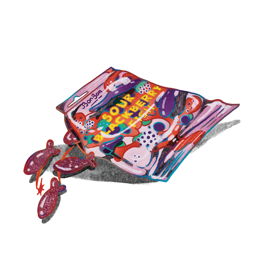 插圖:Bloomberg Businessweek 的 Beya Panicha酸黑莓魚在過去的夏天,BonBon 創始人 Selim Adira、Leonard Schaltz 和 Robert Persson 在他們的祖國瑞典制作果醬。這些進口的天然酸味糖果具有瑞典魚糖的柔軟嚼勁,但口味卻是新鮮採摘的漿果味道,是對三人童年時光的致敬。150克售價$8