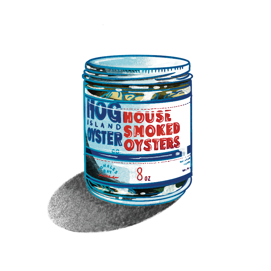 插圖:Bloomberg Businessweek 的 Beya Panicha熏製生蠔今年早些時候,備受讚譽的西海岸供應商 Hog Island Oyster Co. 決定將無法出售給顧客的畸形貝類剝殼並熏製。這些生蠔用清酒、味醂、白醬油和麴混合保存,成為一款富有鮮味的零食,可以直接從罐子裏吃或搭配餅乾食用。8盎司售價$28