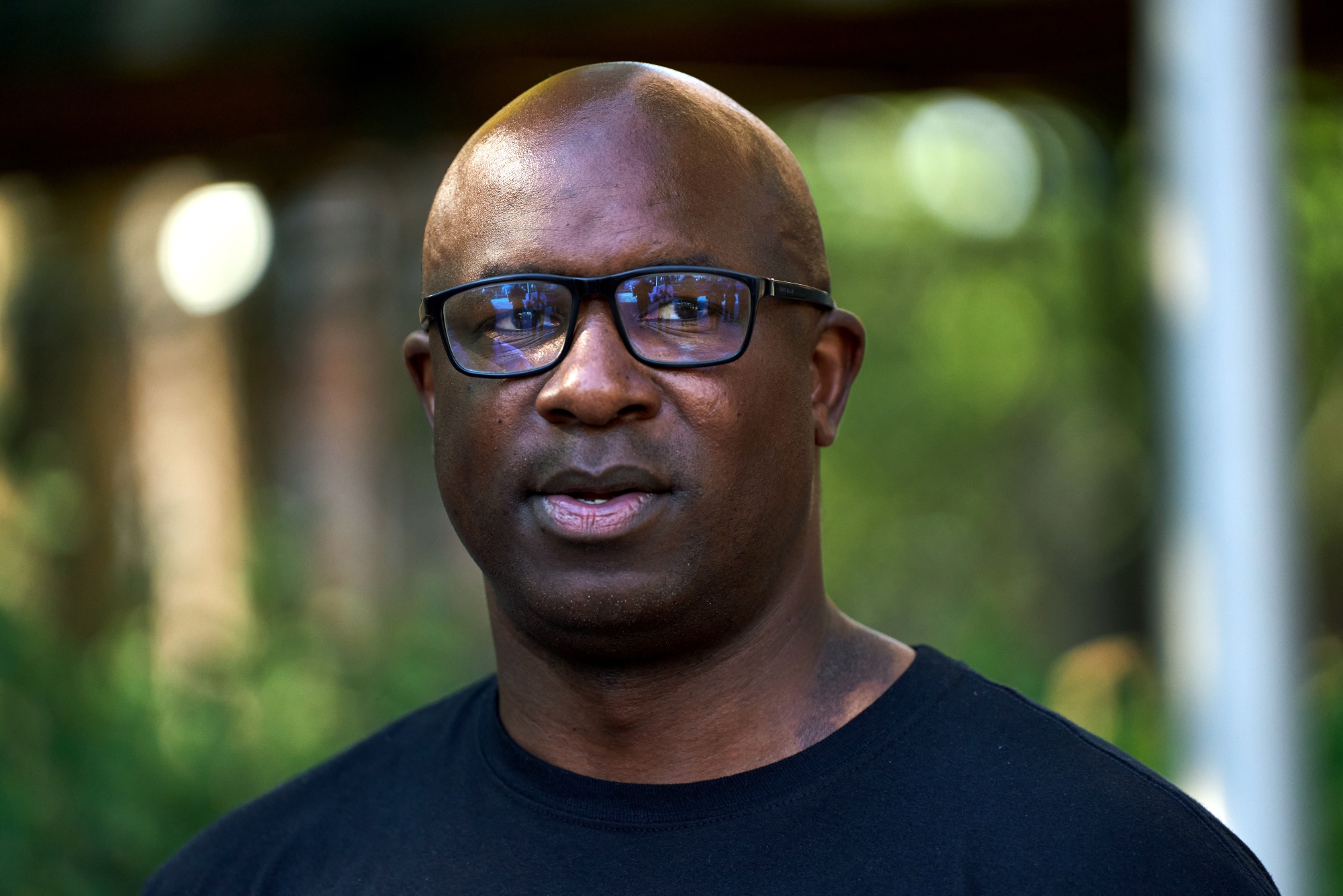 喬治·拉蒂默在星期二的民主黨初選中擊敗了眾議員賈馬爾·鮑曼,星期二在紐約紐羅謝爾的一次競選活動中向媒體發表講話。攝影師:彭冠/彭博社