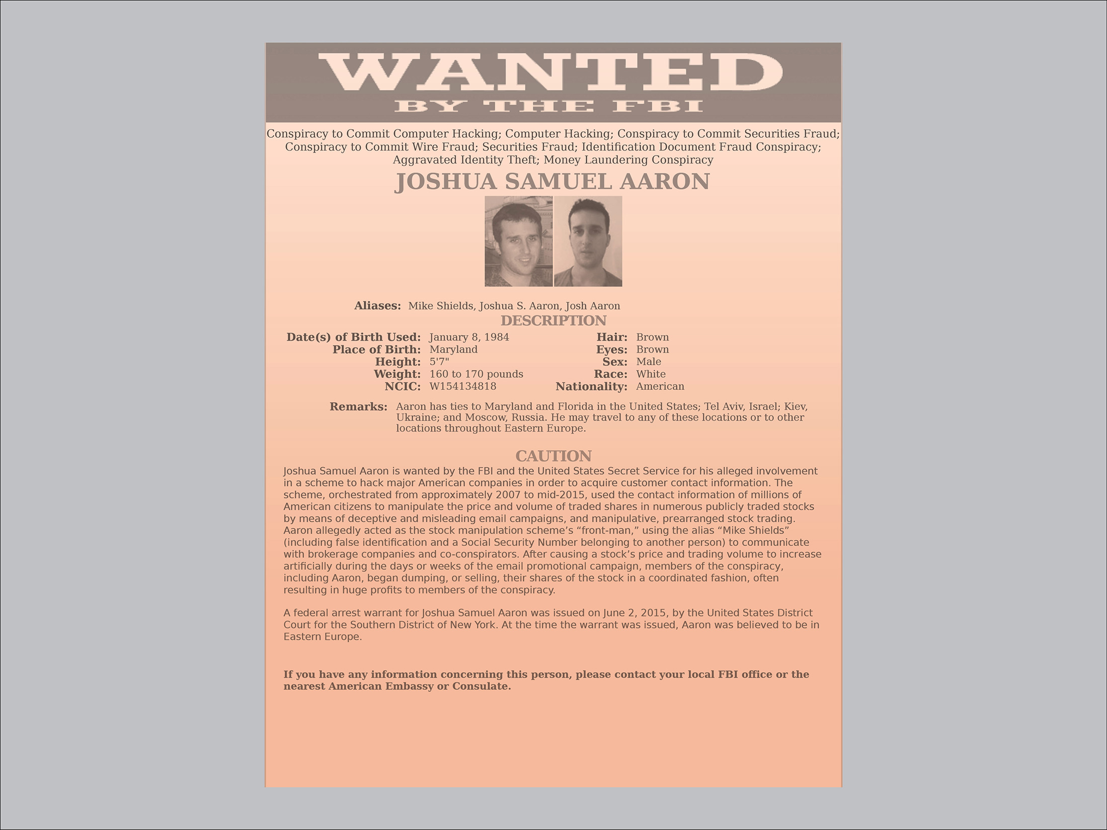 一份喬舒亞·艾倫的通緝海報,沙隆在摩根大通銀行黑客事件中的美國合作伙伴。沙隆幫助美國人把艾倫從俄羅斯帶回美國接受審判。圖片插圖:731;來源:FBI俄羅斯是一個臭名昭著的逃犯避難所,包括愛德華·斯諾登在內,他泄露了大量美國機密。美國官員懷疑沙隆能做多少。然而,2016年5月,莫斯科警方逮捕了艾倫,並以移民罪名起訴他。七個月後,他乘坐商業航班前往美國。