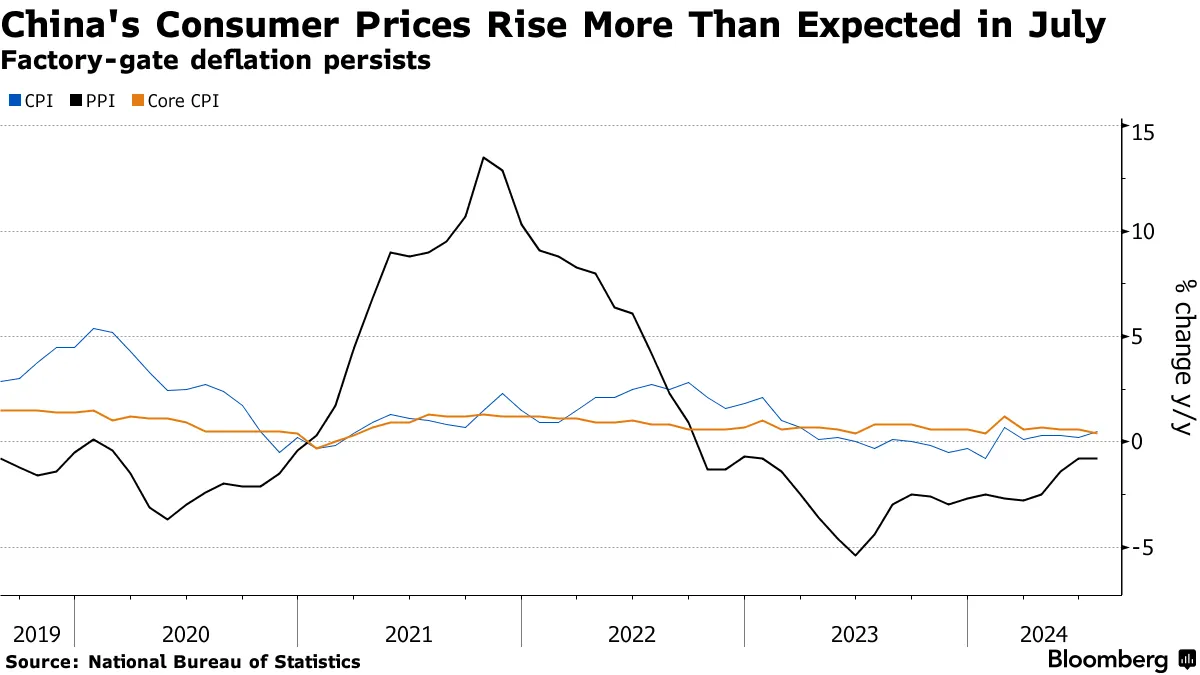中國的 CPI 在 7 月份上漲超過預期,但 對疲軟的國內需求仍然存在擔憂。 核心通脹自 1 月以來上漲幅度最小,而出廠價格延續了長期的通縮趨勢。