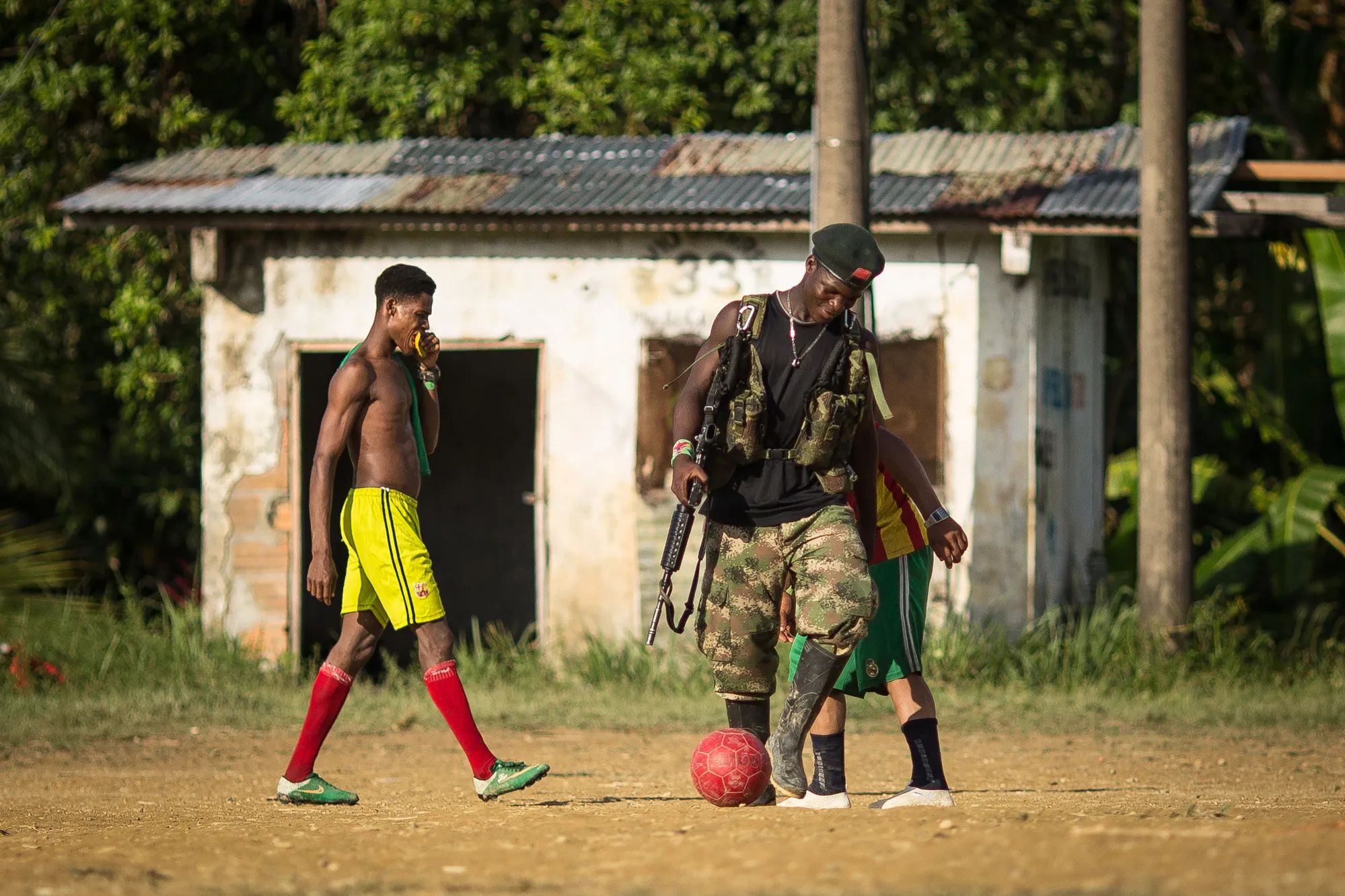 一名ELN游擊隊員在一個偏遠村莊與當地居民一起踢足球攝影師:伊萬·巴倫西亞/彭博社游擊隊因此獲得了對政府遺棄地區帶來投資的認可,同時也為自己獲取一部分利益。