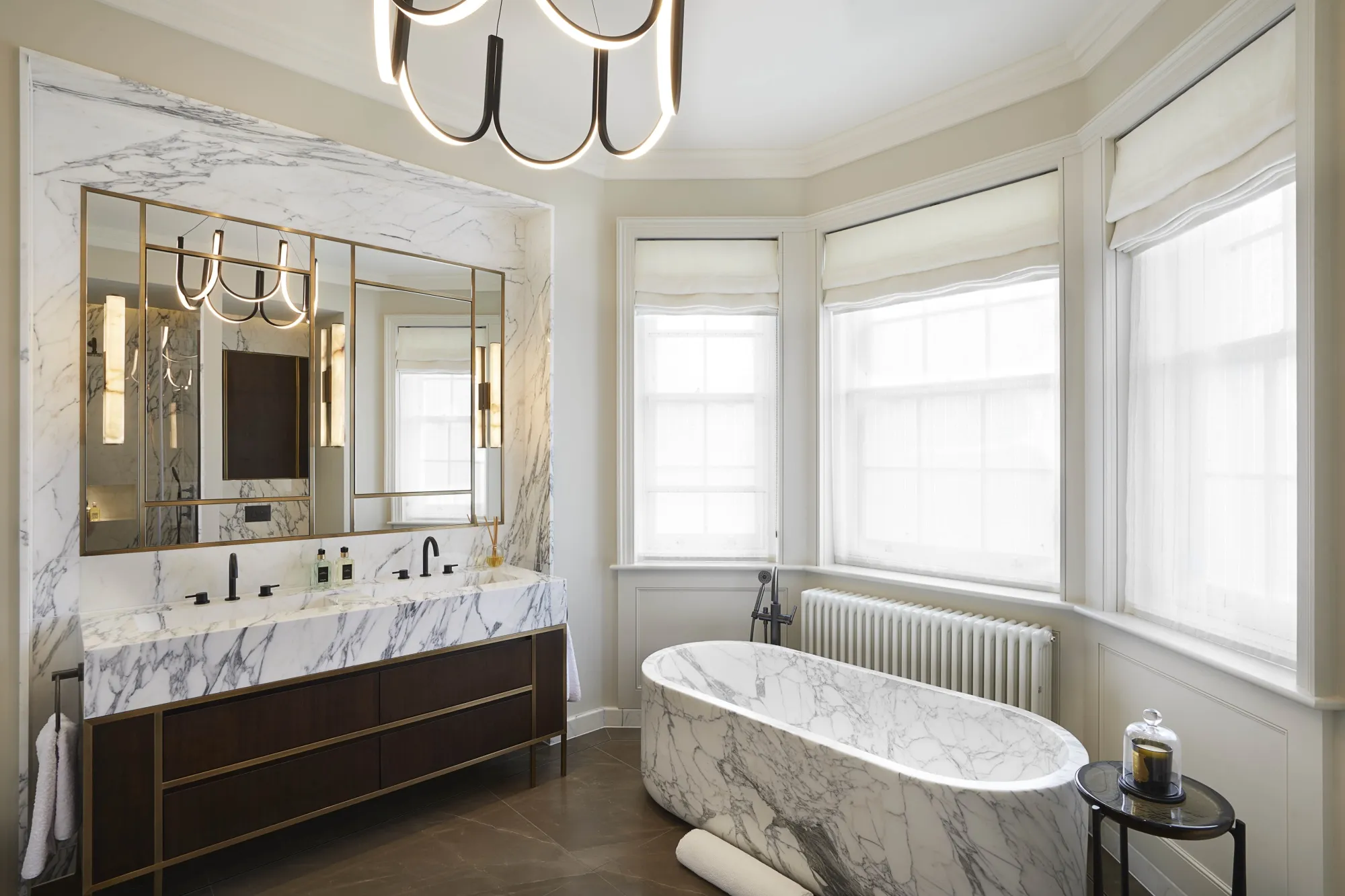 最後,他聘請了MSMR建築師進行該物業的建築工程,該物業最初由著名的新古典主義建築師羅伯特和詹姆斯·亞當於1770年代設計。室內設計來自著名的1508倫敦工作室,以其在比佛利山莊的文華東方住宅和開普優雅酒店而聞名。該物業將全套傢俱出售。傢俱包括手繪壁紙和定製的吊燈及燈具。整個物業都採用大理石,從游泳池區域的牆壁到許多套房的水槽和浴缸。圍牆露台區域被樹籬環繞,給人一種在倫敦中心的隱私感。
