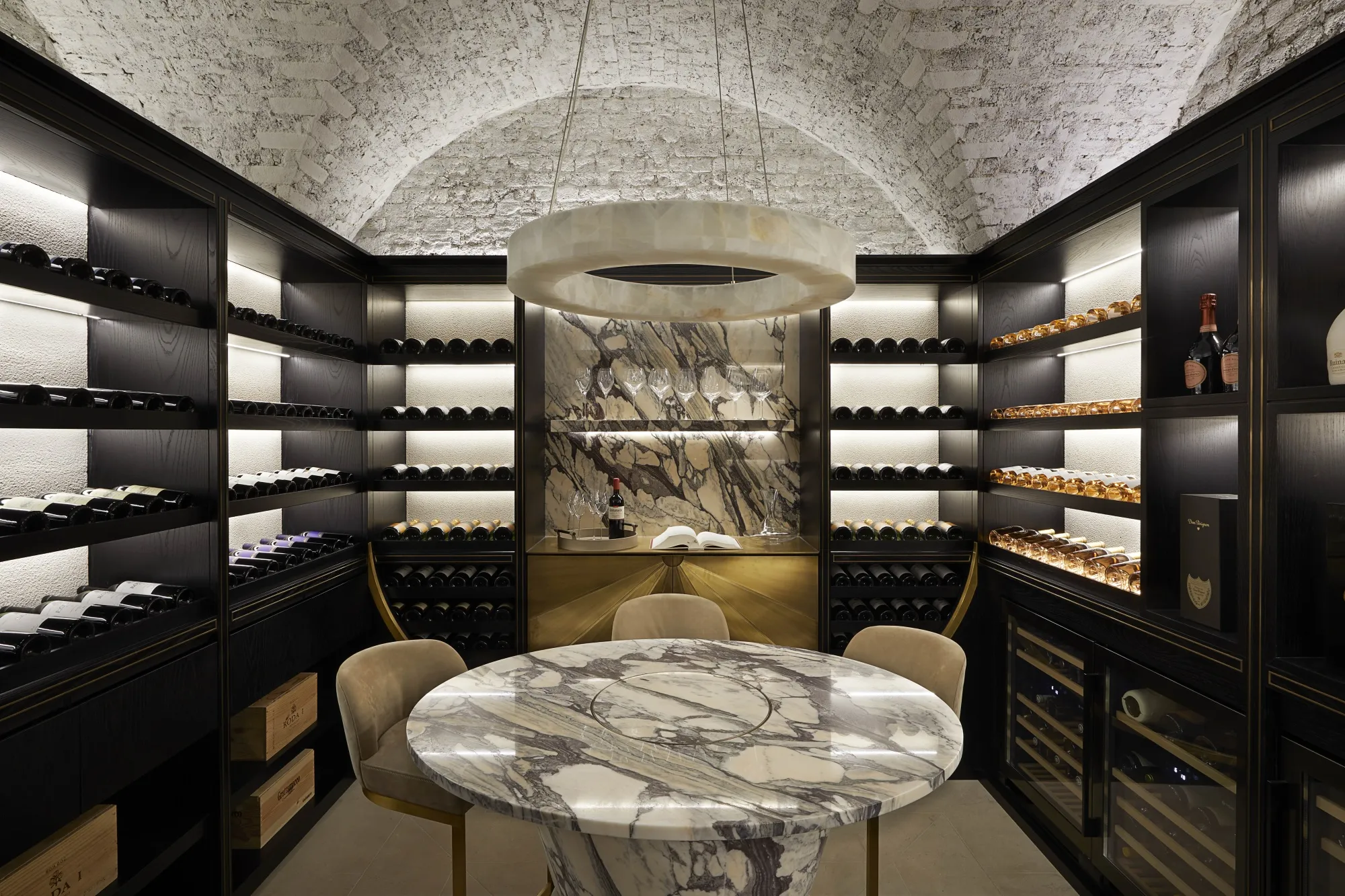 酒窖,配有書本匹配的大理石。來源:奈特·弗蘭克房子本身位於波特蘭廣場,正北面是攝政街,位於倫敦市中心的心臟地帶,夾在中國和哥倫比亞領事館之間。進入時你看到的第一個特色是一個宏偉的樓梯,帶有華麗的喬治風格細節,完全不遜色於 布里傑頓 或皇家宮殿——實際上,這座房子的樓梯在 國王的演講 中代替了喬治的住所。還有一個正式的客廳位於一樓,帶有一個有趣的隱藏功能:有一面液壓牆,配有雙扇桃花心木門,可以通過按下按鈕降入地下,露出一個宏偉的餐廳。代理人表示,這面牆是19世紀的一個特色,家庭工作人員會通過滑輪系統將其升降,以在200年前的晚宴上給客人留下深刻印象。現代建築師只是將這一隱藏的元素帶入了21世紀。