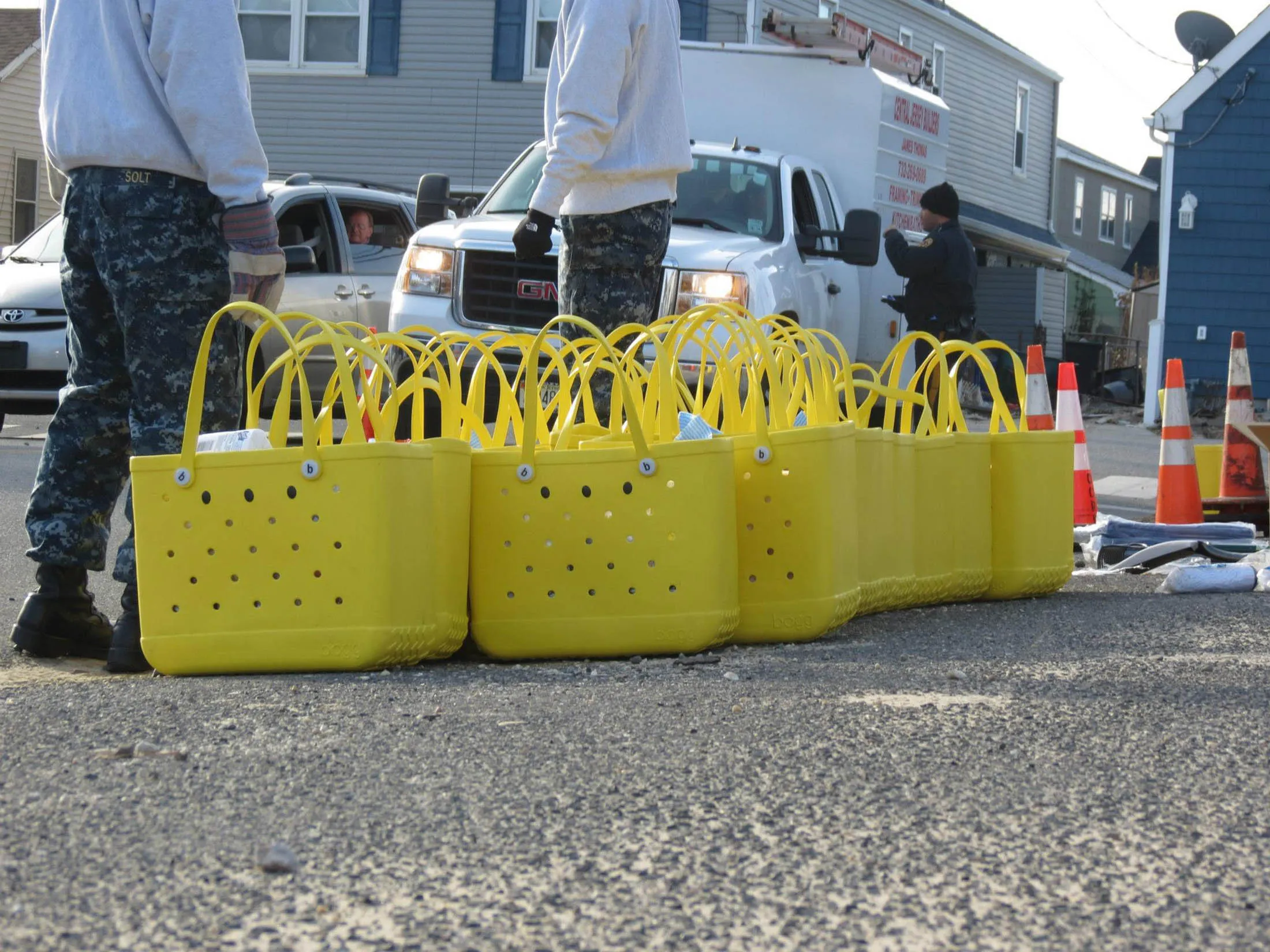 受損的手提袋被存放起來,直到家人終於有理由把它們送到海邊,儘管這個理由遠沒有海灘週末那麼愉快。在2012年秋季,颶風桑迪過後,Vaccarella和她的家人將這些手提袋捐贈給了災後援助組織,他們用這些袋子裝滿了物資——燕麥棒、水瓶、手套、清潔產品——送給那些家園和生意受到損害的人。這似乎是一個合適的去處,因為Vaccarella一直設想這些袋子會在海灘上使用;畢竟,它們耐髒且防潮,髒了可以用水沖洗。