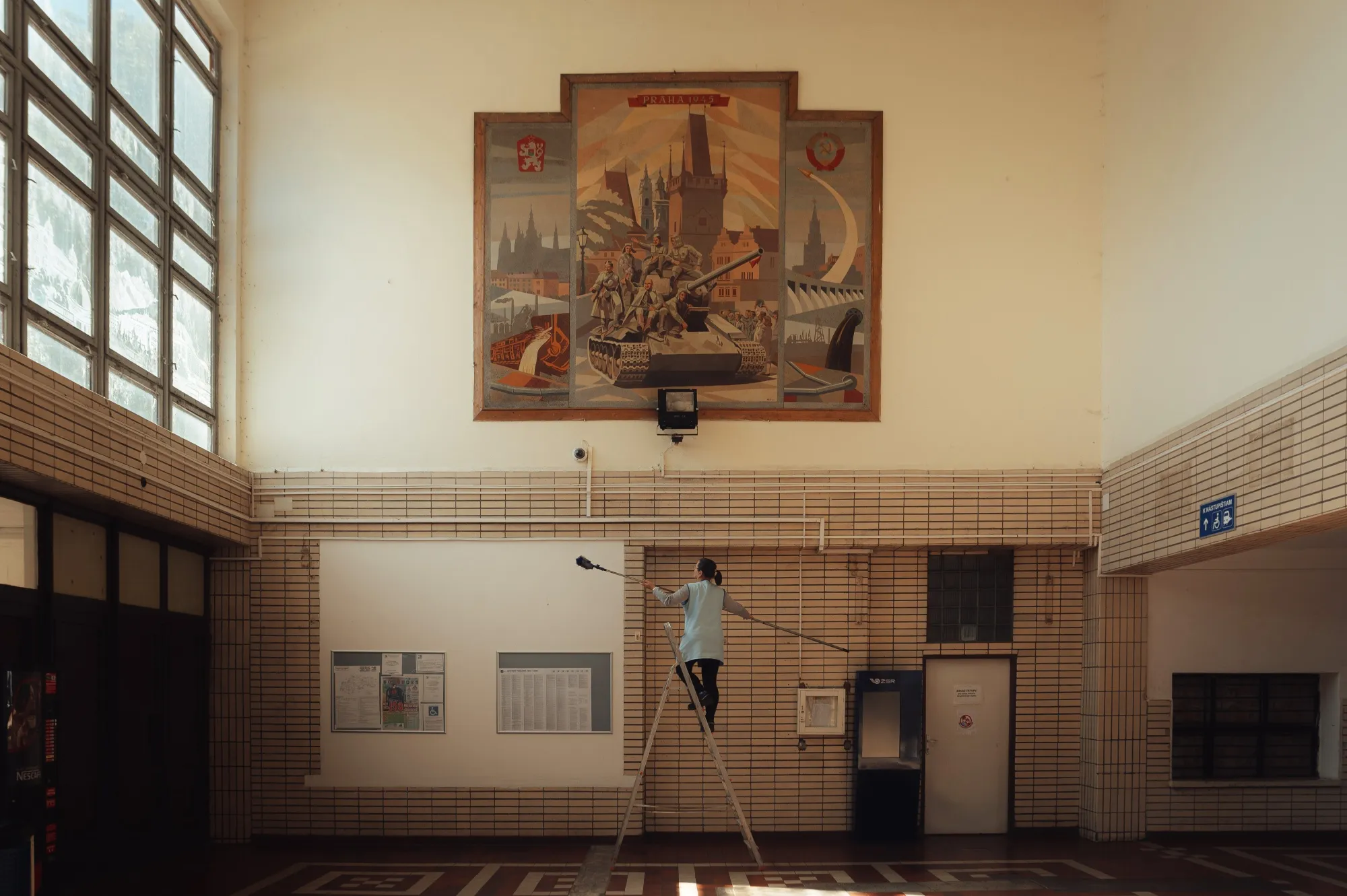 一名清潔工在斯洛伐克的齊爾納納德蒂索火車站擦拭一幅共產主義時代的馬賽克。攝影師:阿納多盧/蓋蒂圖片社在不同的政治背景下,這種務實主義的表現截然不同。