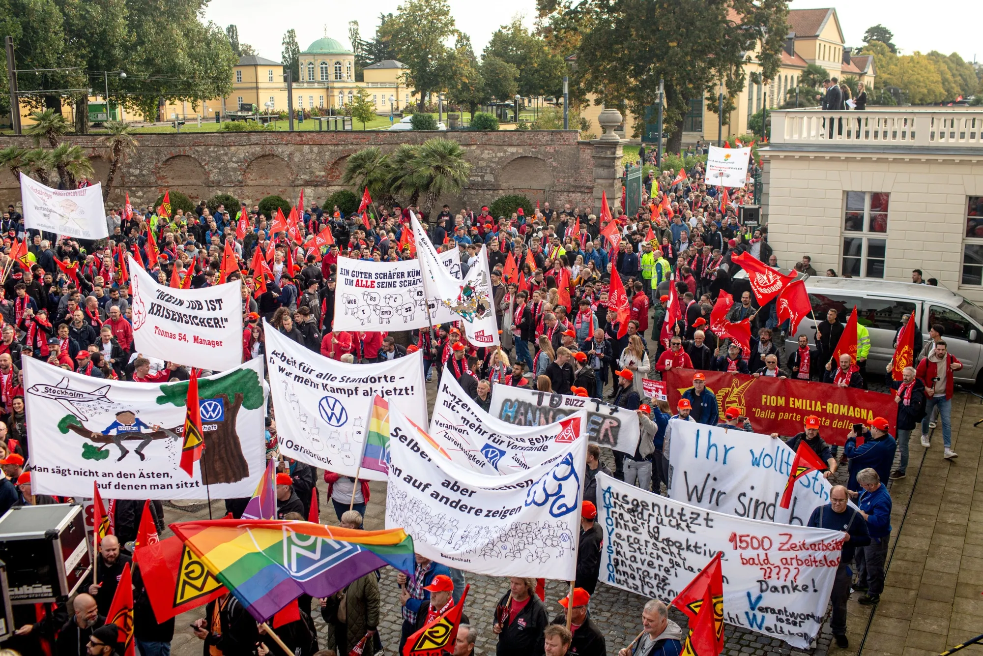 抗議者於2024年9月25日在德國漢諾威參加大眾汽車公司與工會之間談判外的示威活動。攝影師:Yen Duong/Bloomberg根據布魯塞爾戰略視角智庫的執行董事Linda Kalcher的説法,在這種背景下,任何被視為額外負擔的政策都可能受到攻擊。