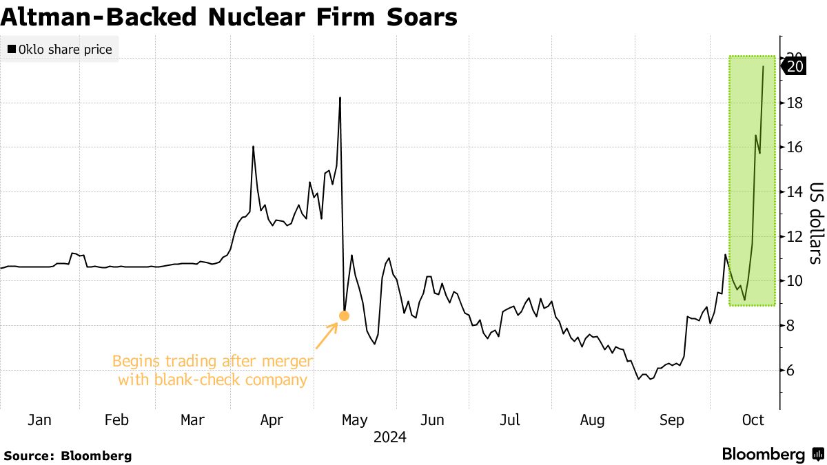 Oklo Inc.的股票在與由OpenAI首席執行官和連續交易者邁克爾·克萊因贊助的空白支票公司合併後於5月上市,本週飆升了115%,創下19.72美元的紀錄。這一漲幅正值亞馬遜公司、億萬富翁金融家肯·格里芬和谷歌揭示了對下一代核能公司的投資。