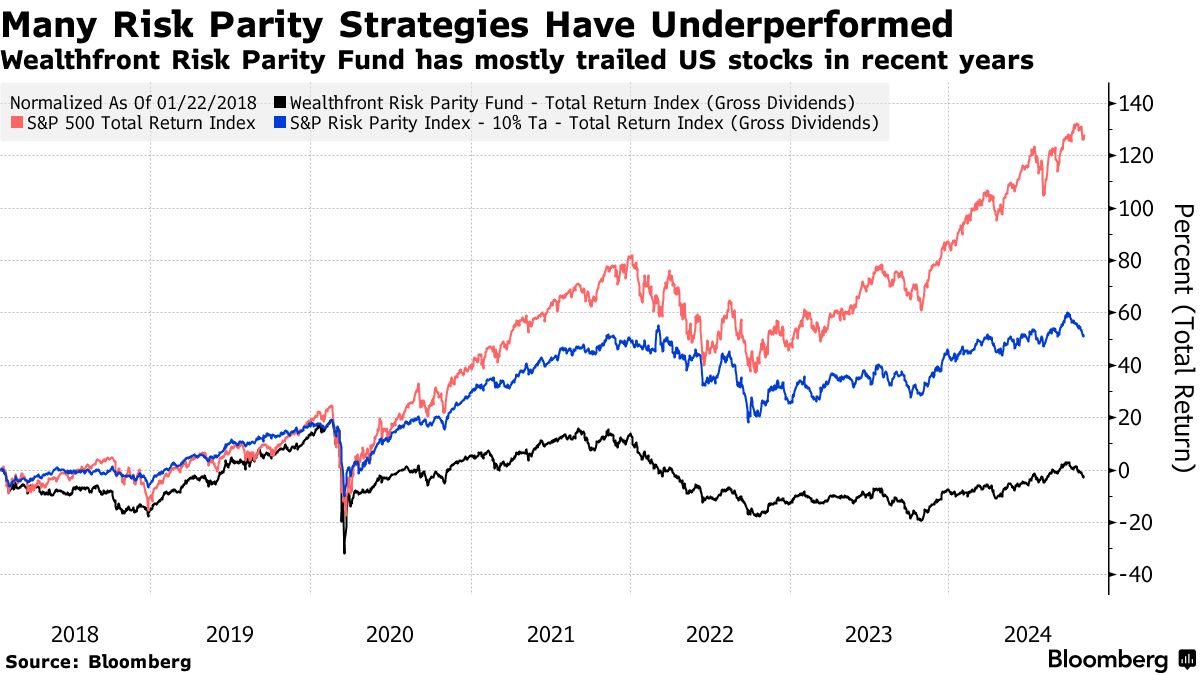 風險平價策略可能有所不同,但總體思路是根據每種資產的波動性進行投資,通常使用槓桿來優化相對於所承擔風險的回報。然而,這種投資風格在近年來常常令人失望,而Wealthfront的版本表現尤其糟糕。