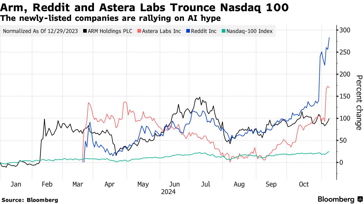 Reddit與其他AI冠軍如Arm Holdings Plc和Astera Labs Inc.並肩而立。作為芯片設計公司的Arm,週四股價上漲最多達6.9%,投資者消化了前一天的財報。儘管其銷售預測令人失望,但Arm的股價在今年迄今幾乎翻倍,因市場對其AI相關業務潛在增長的熱情。