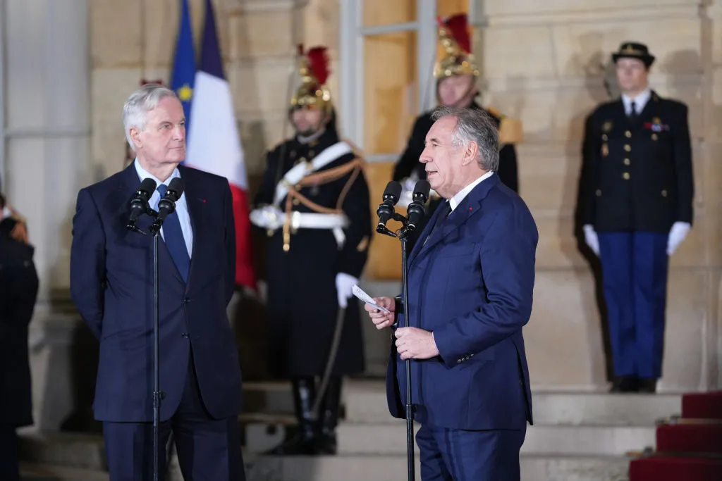 法國即將卸任的總理米歇爾·巴爾尼耶(Michel Barnier)左側,在12月13日與法國新任總理弗朗索瓦·巴伊魯(Francois Bayrou)進行交接儀式。