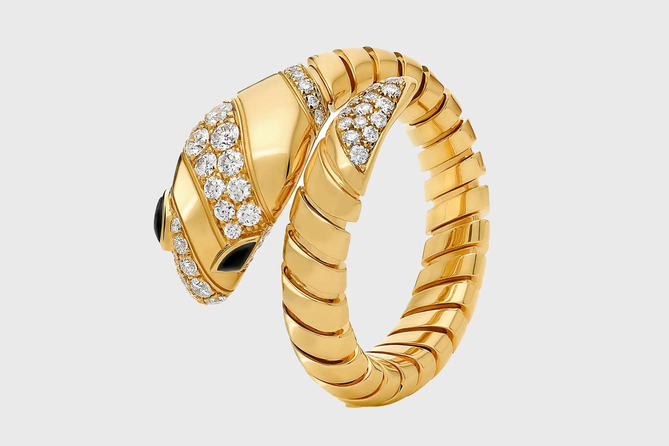 寶格麗蛇形Tubogas戒指,黃金沙。來源:寶格麗智慧與優雅觸手可及農曆新年即將於一月下旬迎來蛇年,這象徵着智慧、直覺、好運和優雅,適合在這一週期出生的人。它也被視為一個轉變之年,因此請隨身攜帶一些好運和智慧,這款售價9,500美元的18克拉黃金沙戒指結合了寶格麗標誌性的蛇形圖案和彈性Tubogas設計語言,鑲嵌了鑽石和黑瑪瑙。