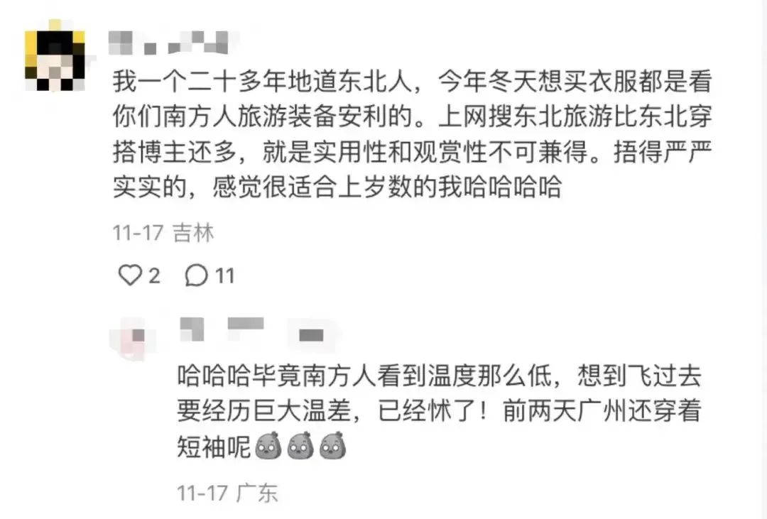 從冰雪大世界爆火開始,在社交平台上,各種各種東北穿衣公式和保暖攻略,就成了流量密碼。