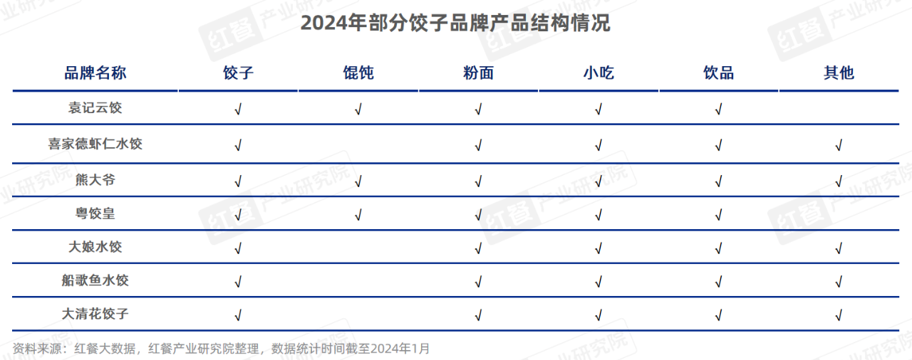在大部分餃子連鎖品牌的產品中,除了餃子外,還會涵蓋粉面、小吃、飲品等產品,例如拌麪、花生米、玉米汁等。