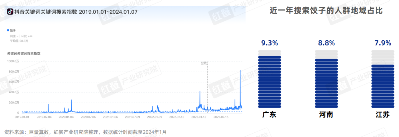 近一年來餃子賽道的熱度呈現波動上升的走勢,其抖音單日搜索指數在2023年冬至當天突破了830萬,創下近5年來的新高。據巨量算數,近一年(截至2024年1月),在搜索餃子關鍵詞的人羣中,廣東、河南、江蘇等地的人羣佔比排名靠前。