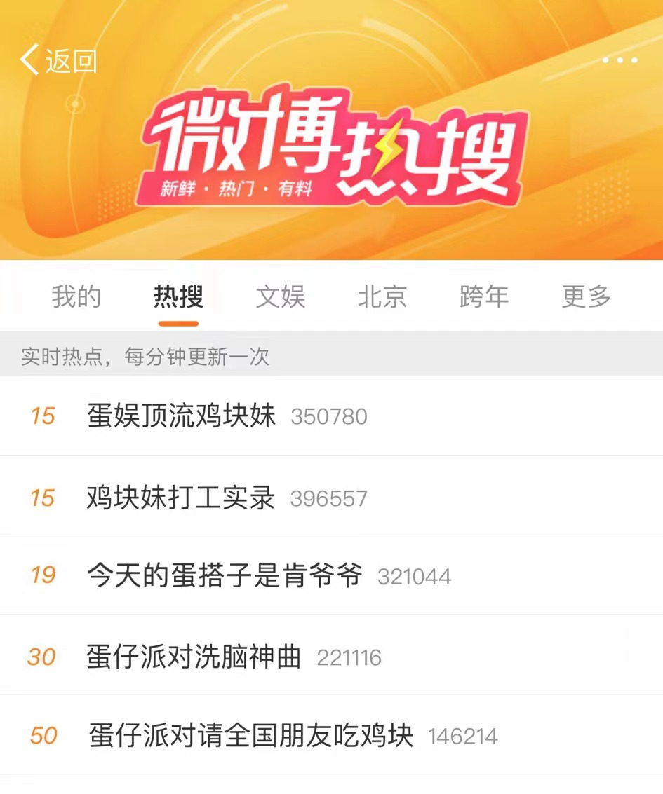 而官方對於用户興趣洞察,也同樣被用户默契get到了,掀起了自發傳播的新高潮。#蛋仔派對肯德基聯動#、#今天的蛋搭子是肯爺爺#、#蛋仔派對洗腦神曲#、#蛋娛頂流雞塊妹#等相關聯動話題迅速登上微博熱搜榜,僅#蛋仔派對聯動肯德基#這條微博熱搜就有3.4 億的閲讀量。