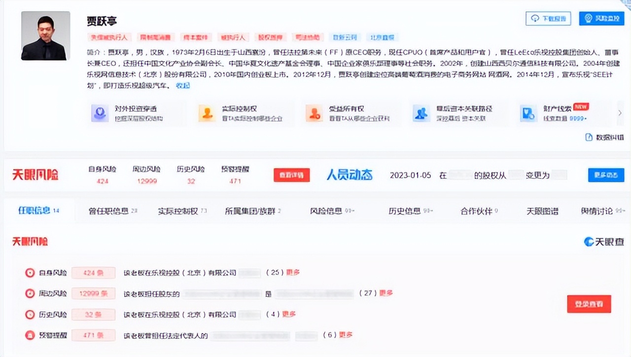 關於賈躍亭的消息,最近的一次是去年11月初。當時,賈躍亭與樂視控股公司新增了一條被執行人信息,原因是借款合同糾紛。這些年,賈躍亭欠下了鉅額的債務,多次被執行。而更早之前,樂視因虛假陳述被起訴,賈躍亭作為連帶責任人,需向股東賠償高達20億的資金。除此之外,賈躍亭還被列為失信被執行人、限制高消費等。負面傳聞如影隨形,從未間斷。