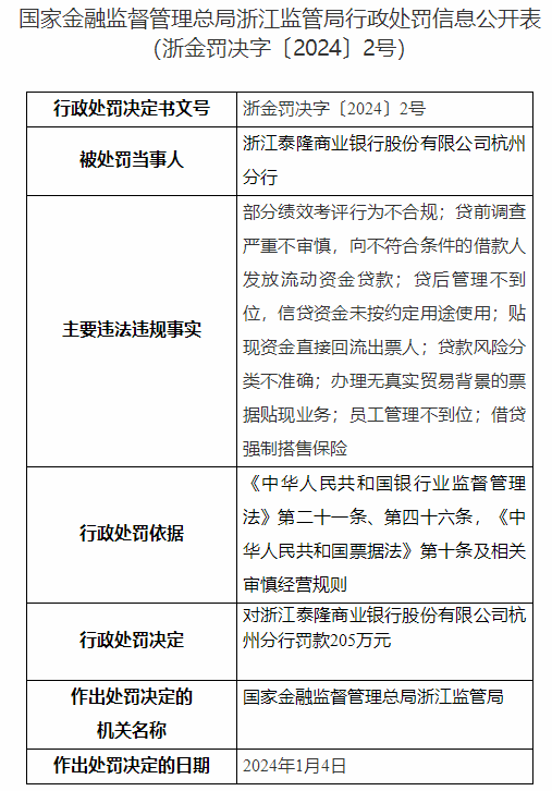 1月9日,據國家金融監督管理總局浙江分局發佈的行政處罰信息,浙江泰隆商業銀行股份有限公司杭州分行(下稱泰隆銀行杭州分行)因8宗罪被罰205萬元。