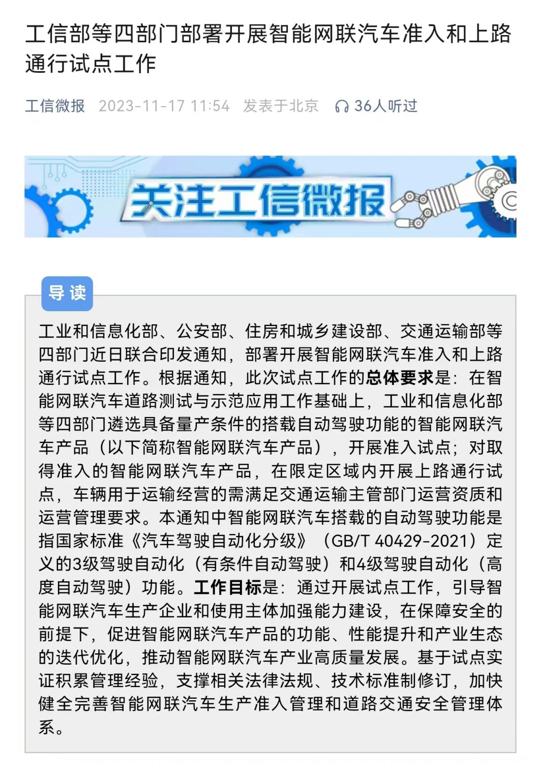1、被“瘋搶”的L3牌照2023年11月17日,工信部、公安部、住建部和交通部聯合發文,“決定開展智能網聯汽車准入和上路通行試點工作。”
