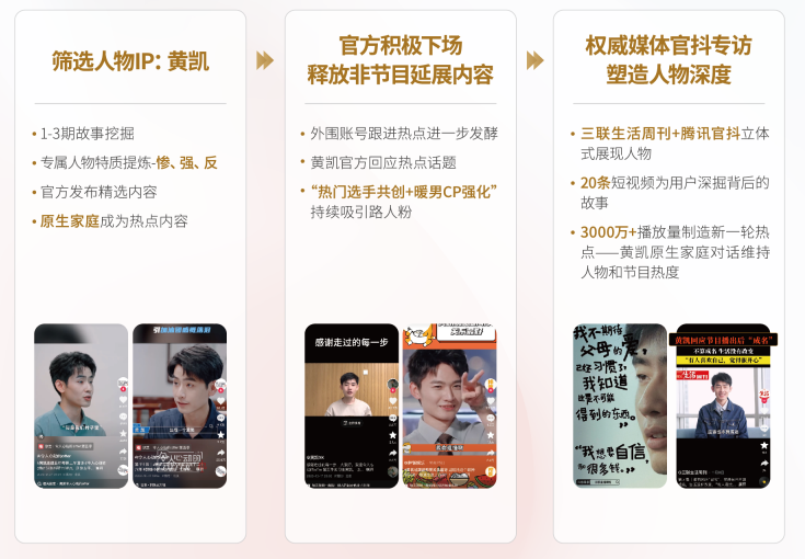 最終黃凱憑藉自身的勵志人設,其個人賬號從所有人中脱穎而出,5天迅速吸粉50萬,半個月個人抖音號粉絲數從0飆升至110萬,也反向吸引更多黃凱粉絲迴歸長視頻,追更綜藝。