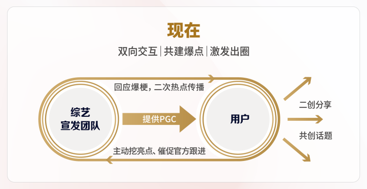 在以雙向互動為主要特徵的新傳播環境下,需要一套全新的宣發思路:在短視頻興趣圈層的內容分發邏輯之下,真正的“爆梗”不再是宣發團隊自己圈出的內容重點,而是來自與用户的共創。官方提供PGC內容,核心綜藝用户圈層主動挖掘亮點形成爆梗,再擴散到泛綜藝用户。
