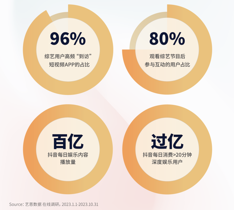 一個有趣的現象是,綜藝用户和短視頻APP用户是高度重疊的。根據《2023抖音綜藝宣發白皮書》顯示,96%的綜藝用户高頻到訪短視頻APP,抖音每日觀看20分鐘以上的深度娛樂用户過億。