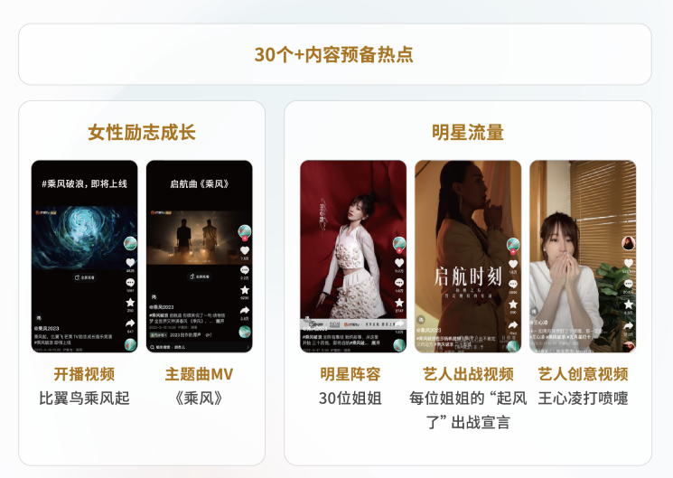 《乘風破浪3》中,王心凌走紅的例子就是典型的代表。表面上我們看到的是一曲《愛你》激活全網“王心凌男孩”。但實際上,宣發團隊在開播前5天起,就已經預埋了大量熱門內容進行測試。官方賬號陸續發佈了30+個預備短視頻,包括比翼鳥乘風起的開播視頻、30位明星陣容,藝人出戰視頻等等。