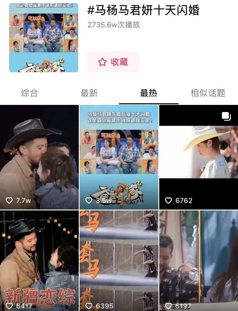 例如《爸爸當家2》中,光一個#馬楊馬君妍十天閃婚 這一花絮內容,就在“抖音活人們”不斷造梗之中熱度攀升,其抖音話題播放量就超過2700萬,#馬楊馬君妍先婚後愛 #馬楊馬君妍是翻版惡作劇之吻吧 #馬楊馬君妍新疆戀綜 等二創話題陸續加入,這批不斷被造梗和二創解構的熱門內容,助力節目本身迎來了單日播放映指數最高點,較平均值上漲12.7%。