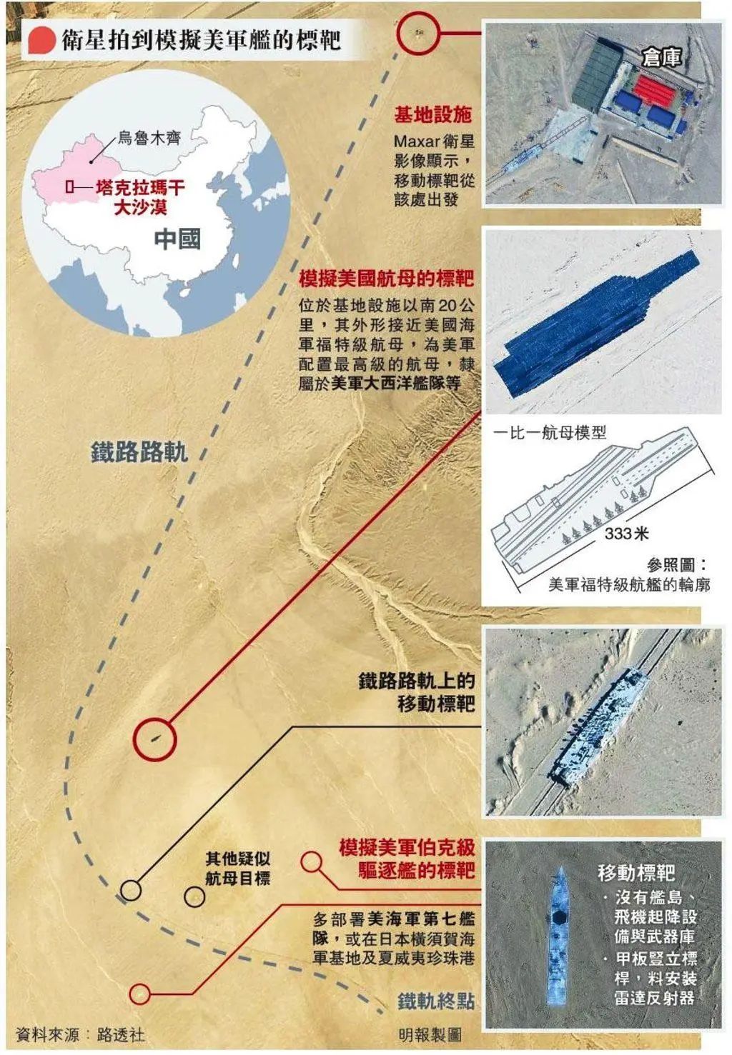 另據此前的公開報道,位於若羌地區還有稍小一點的航母以及驅逐艦和兩棲攻擊艦,甚至還為兩棲攻擊艦設置了一條可以轉彎的移動軌道,用巨型移動靶的模式等比例海原真實作戰環境,看起來中國的彈道導彈打航母不僅玩真的,還是超高難度!