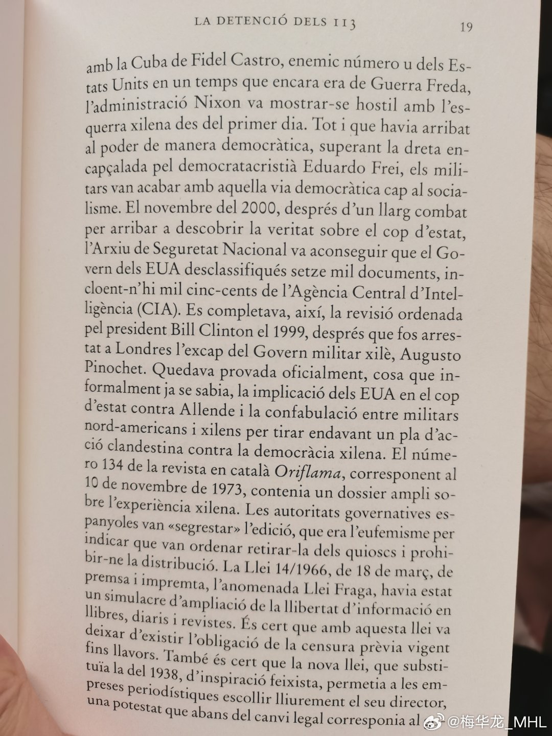 加泰羅尼亞語那本(圖四、圖五)就更難懂一些。大概的意思能看出來,但有一些句法不太明白,大概就是關於美國參與推翻阿連德左翼政府及其證據曝光的事情。